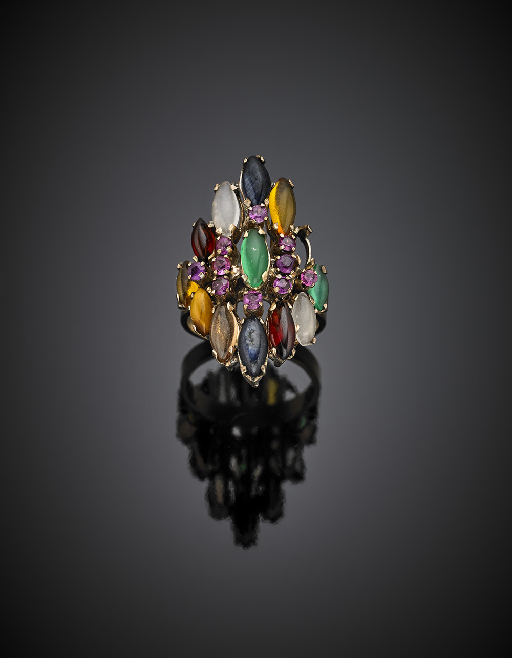 Anello in oro giallo 333/1000 con gemme varie cabochon, g 6,08 misura...