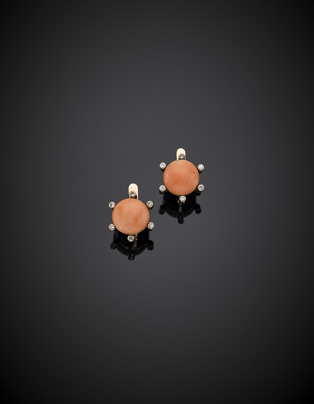 Orecchini a lobo in corallo arancione, diamanti e oro giallo, g 5,23, lungh. cm 1,5 circa.