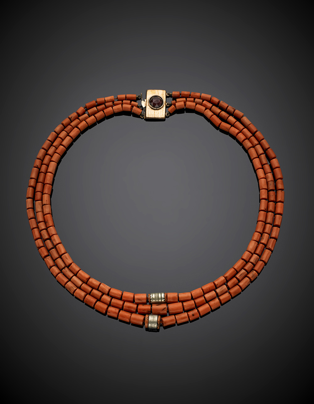 Collana a tre fili di barilotti di corallo arancione e chiusura in oro rosso e granato sfaccettato a mezza rosetta, dettagli in argento, g 92,33, lungh. cm 51,50 circa.