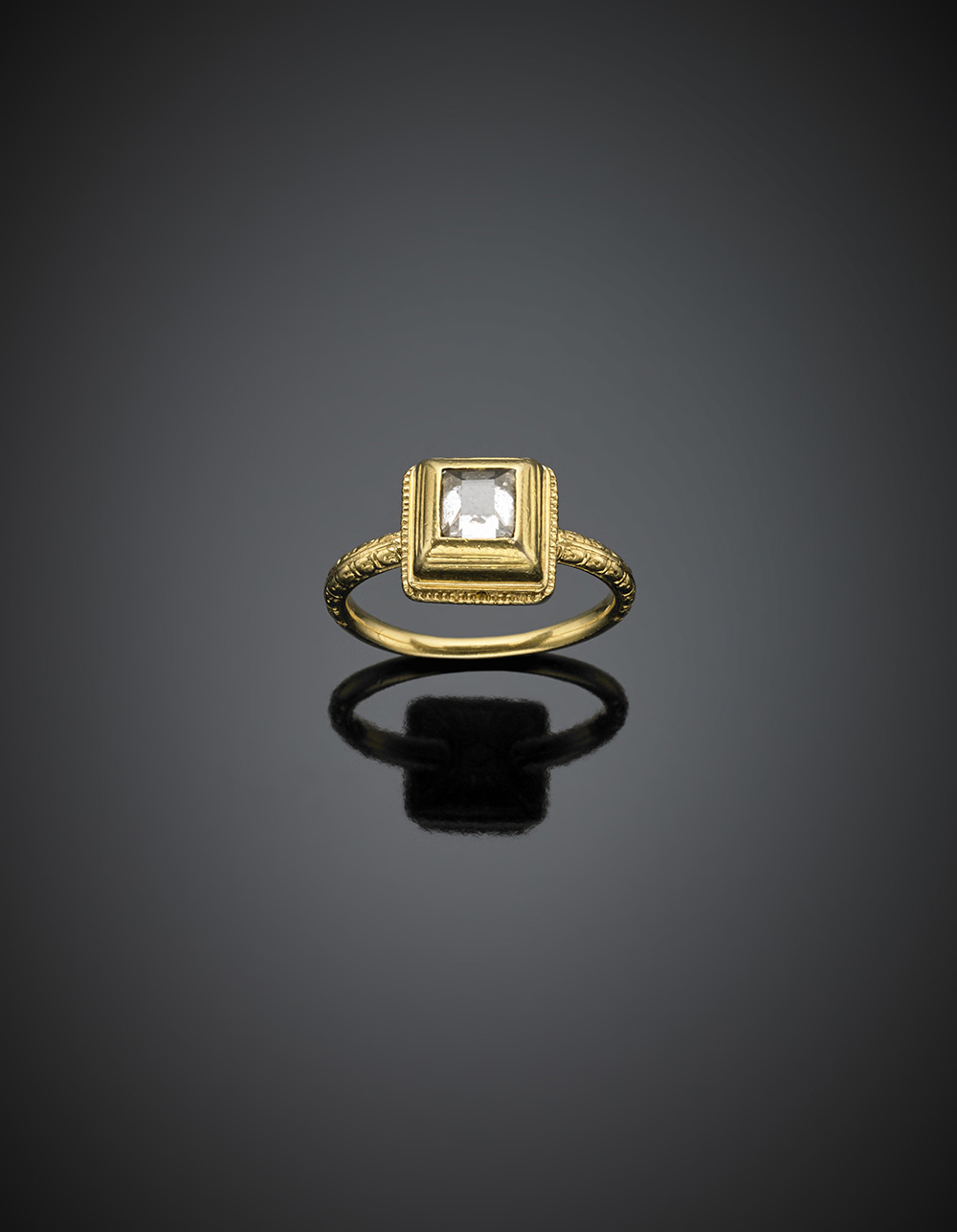 Anello in oro giallo e gemma incolore, g 9,75 misura 14/54.