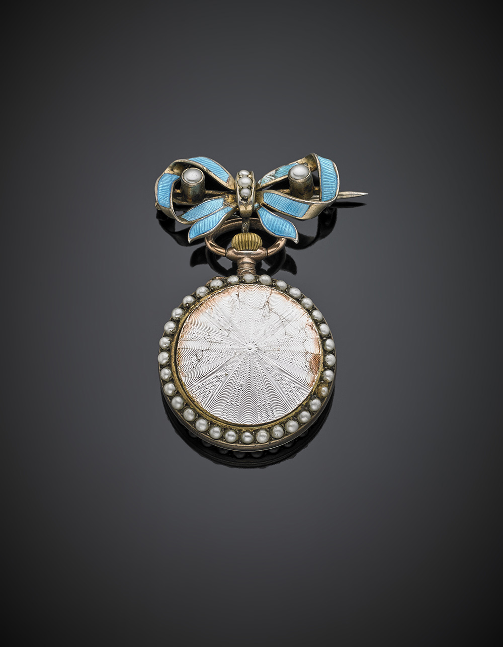 Broche con orologio pendente in argento e oro rosso 333/1000 rifinito con smalti guilloché e piccole perle, g 22,82, lungh. cm 5,1 circa. (difetti)