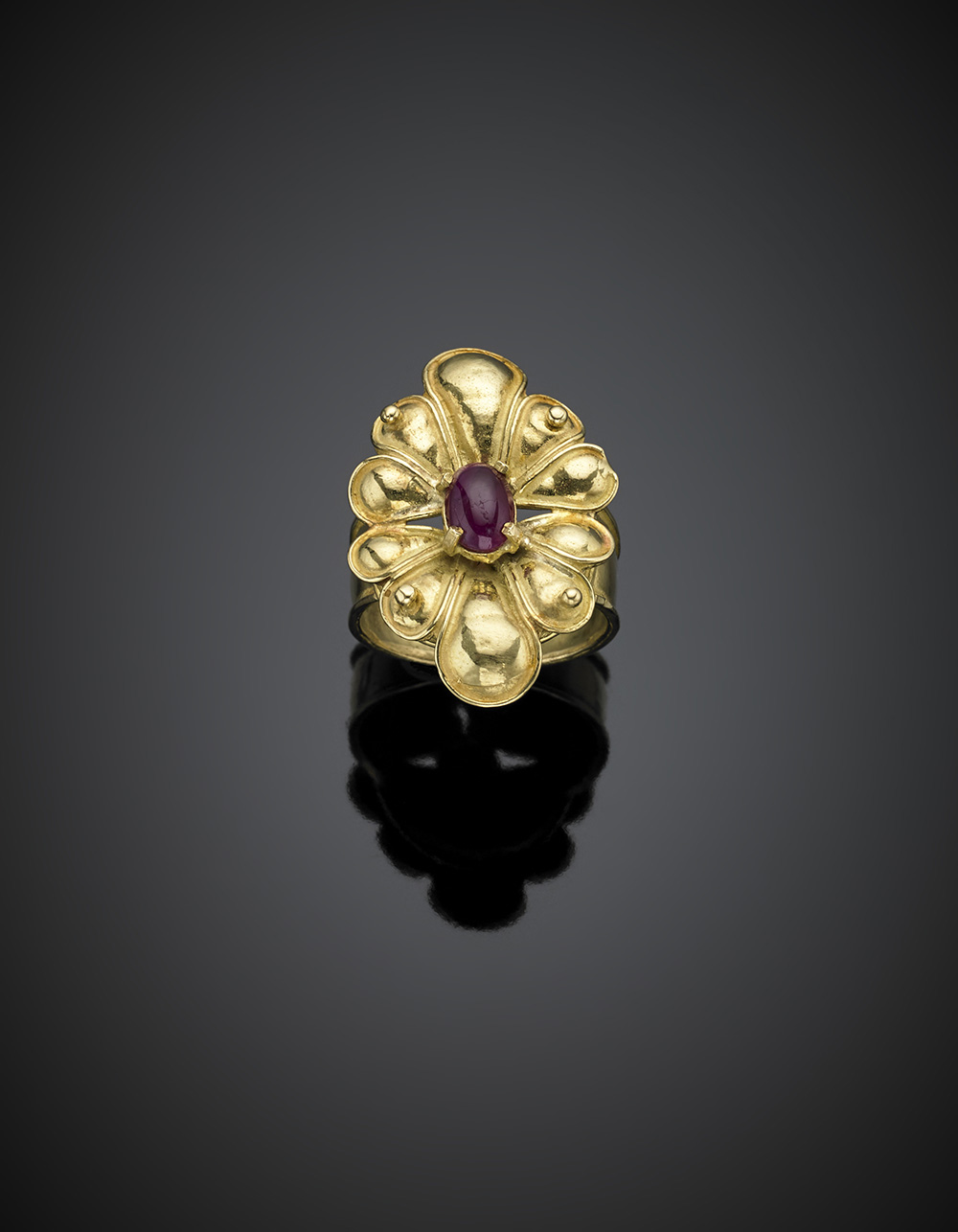 Anello in oro giallo a fiore con al centro un rubino ovale cabochon, g 8,05 misura 15/55.