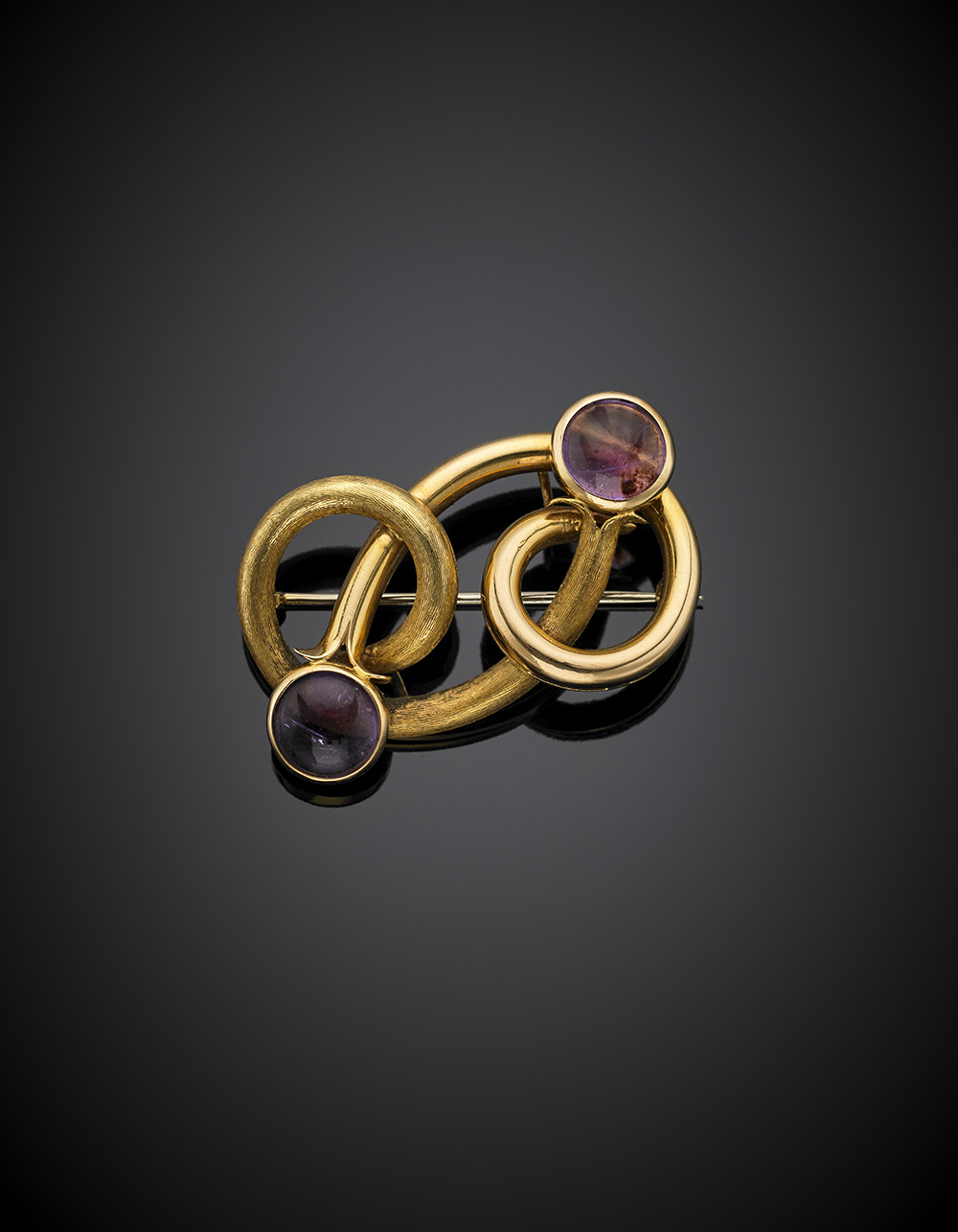 Spilla in oro giallo in parte cesellato, a volute con due ametiste cabochon,...