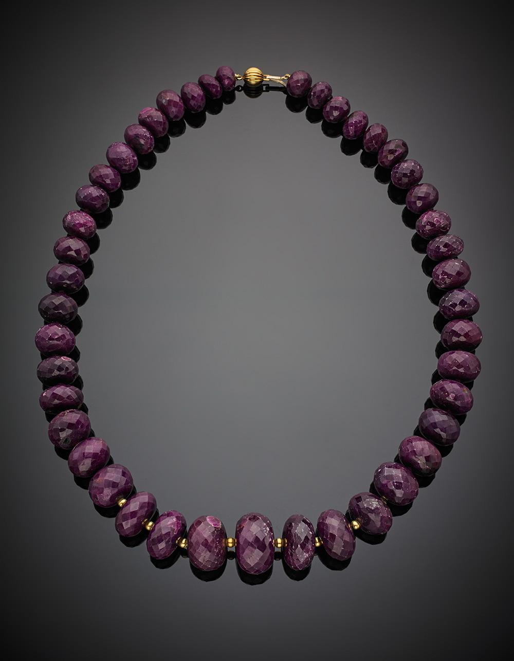 Faceted and graduated ruby bead necklace accented with yellow gold spacers and clasp, bead diam from mm 24.85 to mm 13.83, g 391.50, length cm 63 circa. (defects)