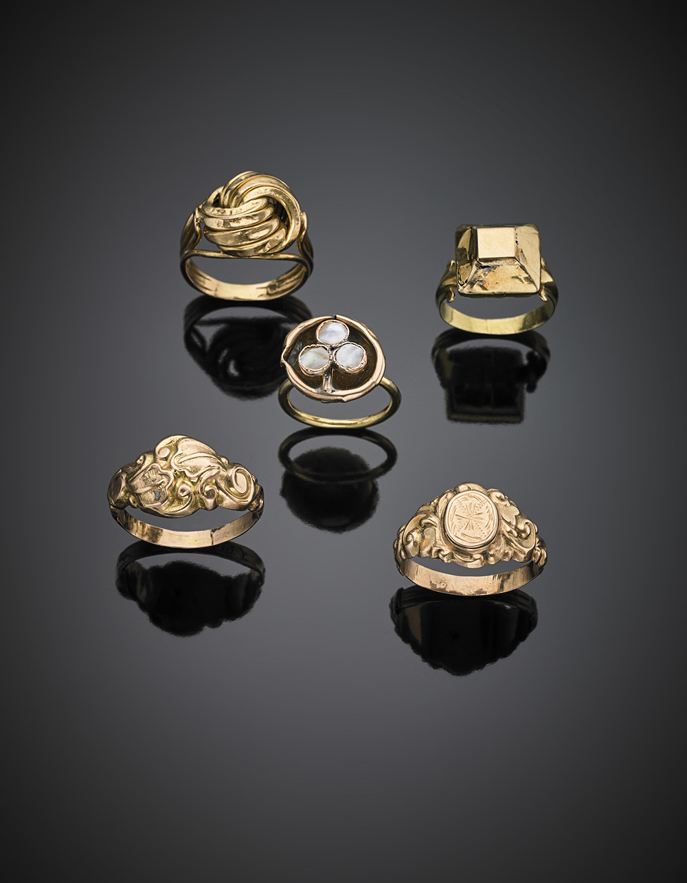 Cinque anelli in oro di varia foggia uno con madreperla, complessivi g 14,09 misura da 5/45 a 19/59. (lievi difetti)
