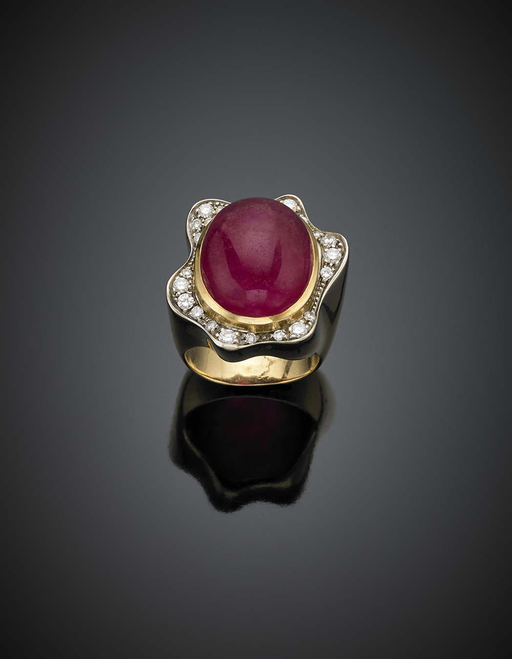 Anello in oro giallo e bianco con diamanti rotondi a contornare un quarzo tinto ovale cabochon, g 24,28 misura 17/57.
