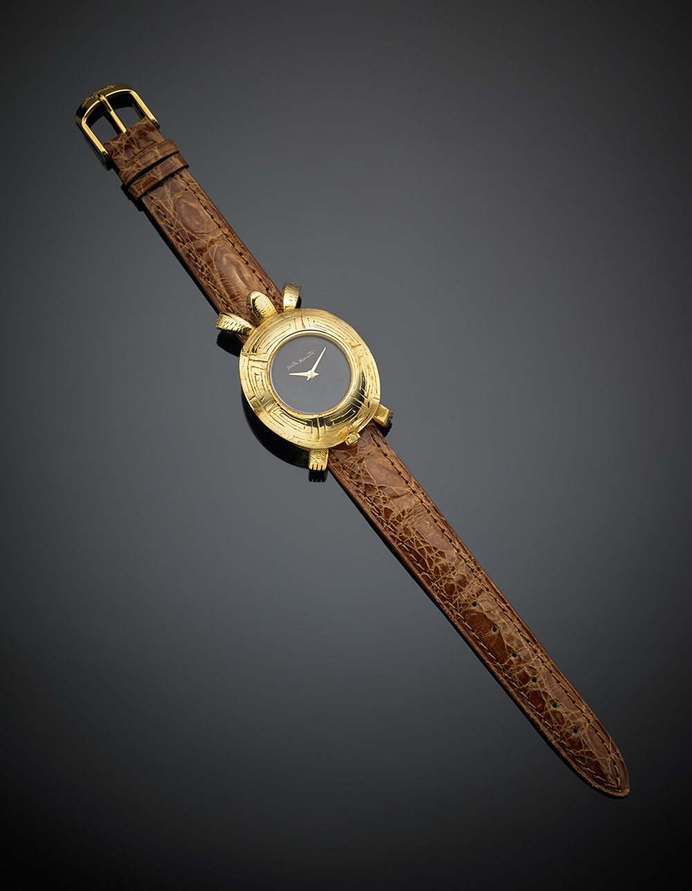 Yellow gold "turtle" watch with crocodile leather strap, g 44.40, length cm 22.20 circa. Case, dial and strap signed Marta Marzotto. Original case and tag