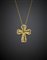 Catena con pendente a guisa di croce rifinito in smeraldi e rubini cabochon, il tutto in oro giallo, lungh. pendente cm 4.8, g 13,83, lungh. cm 50 circa.