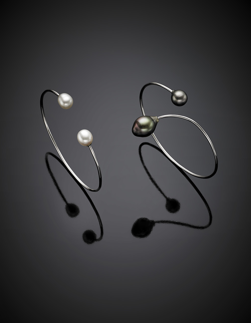 Due bracciali a filo alla schiava in oro bianco, uno con perle grigie di mm 11.45 e mm 8.95 circa, l'altro con perle bianche di mm 7,75 circa, complessivi g 15,23, diam. cm 6,5. Garanzia originale