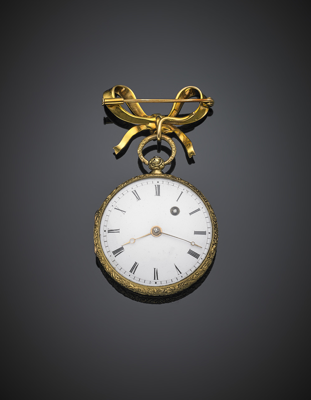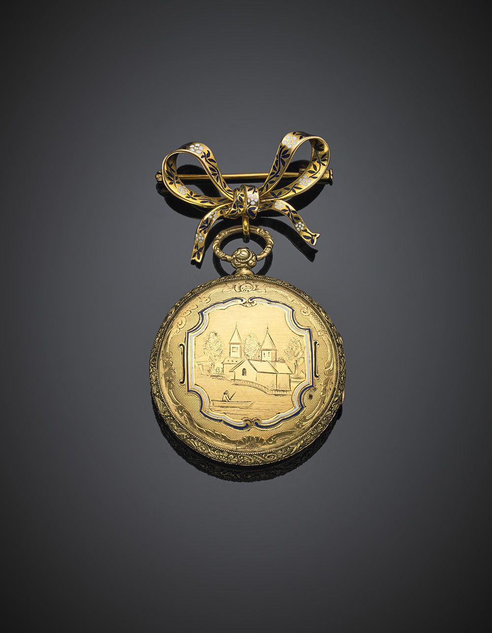 Yellow chiselled gold and enamel bow brooch with pendant watch, g 38.03, diam. cm 3.5.