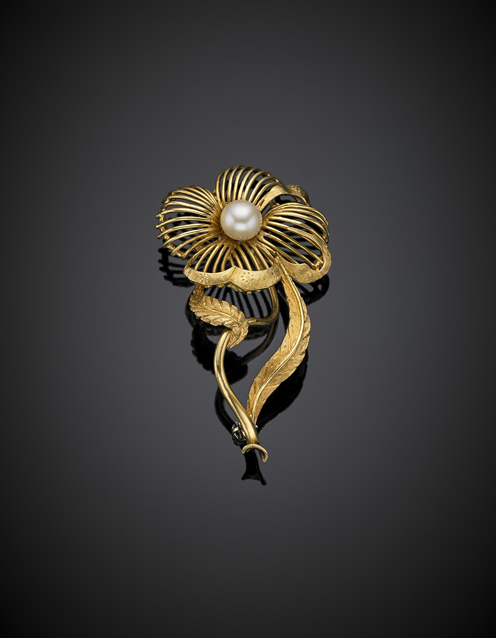 Spilla in oro giallo cesellato e satinato a forma di fiore con perla...