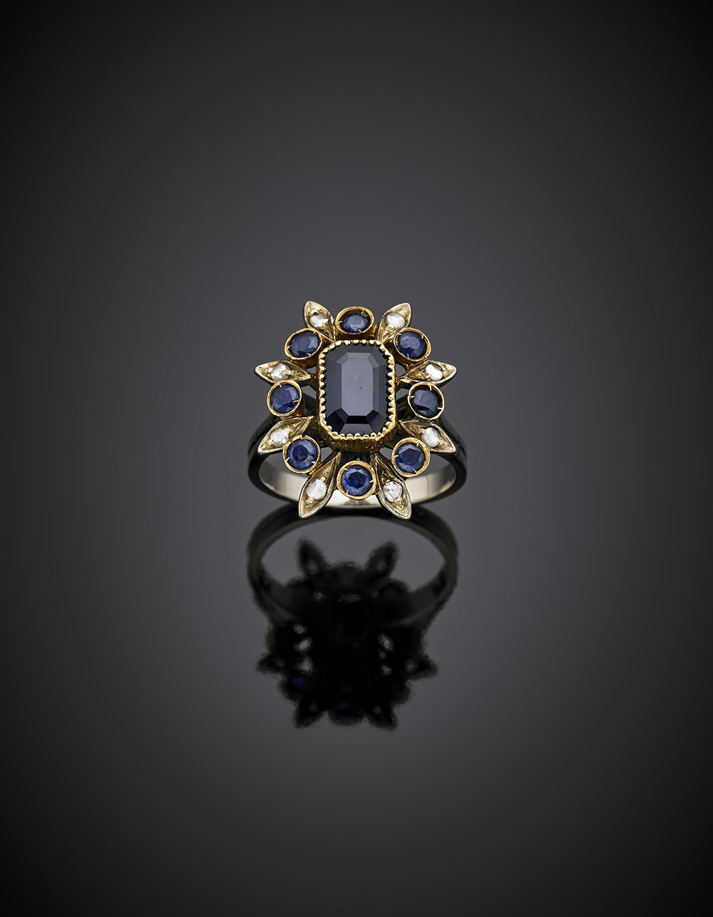 Anello in oro bianco e giallo a stella con diamanti e zaffiro centrale rettangolare, g 6,35 misura 13/53.
