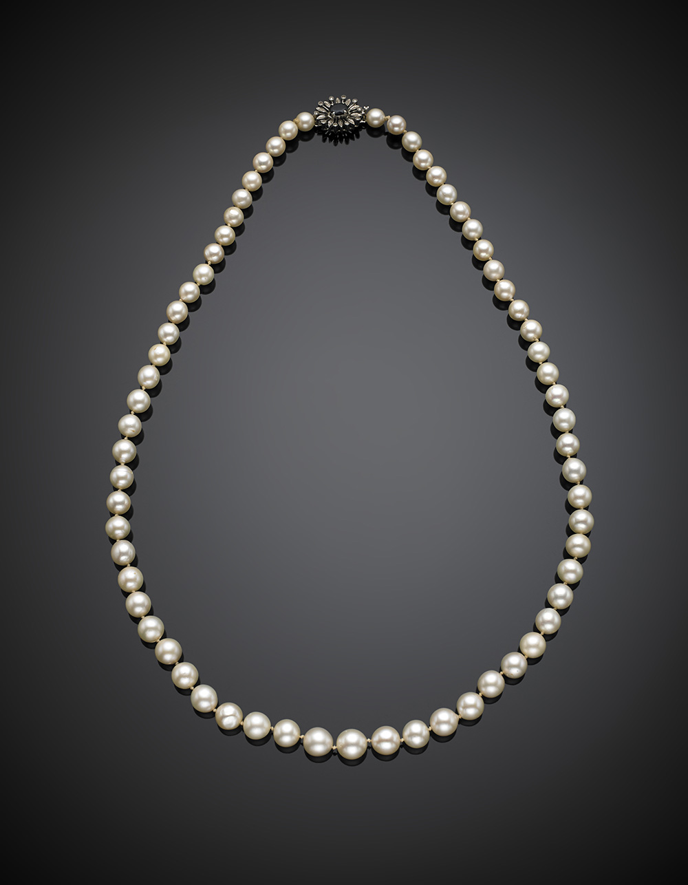 Collana a scalare perle coltivate con chiusura in oro bianco zaffiro e diamanti, g 56,48, lungh. cm 64,50 circa.