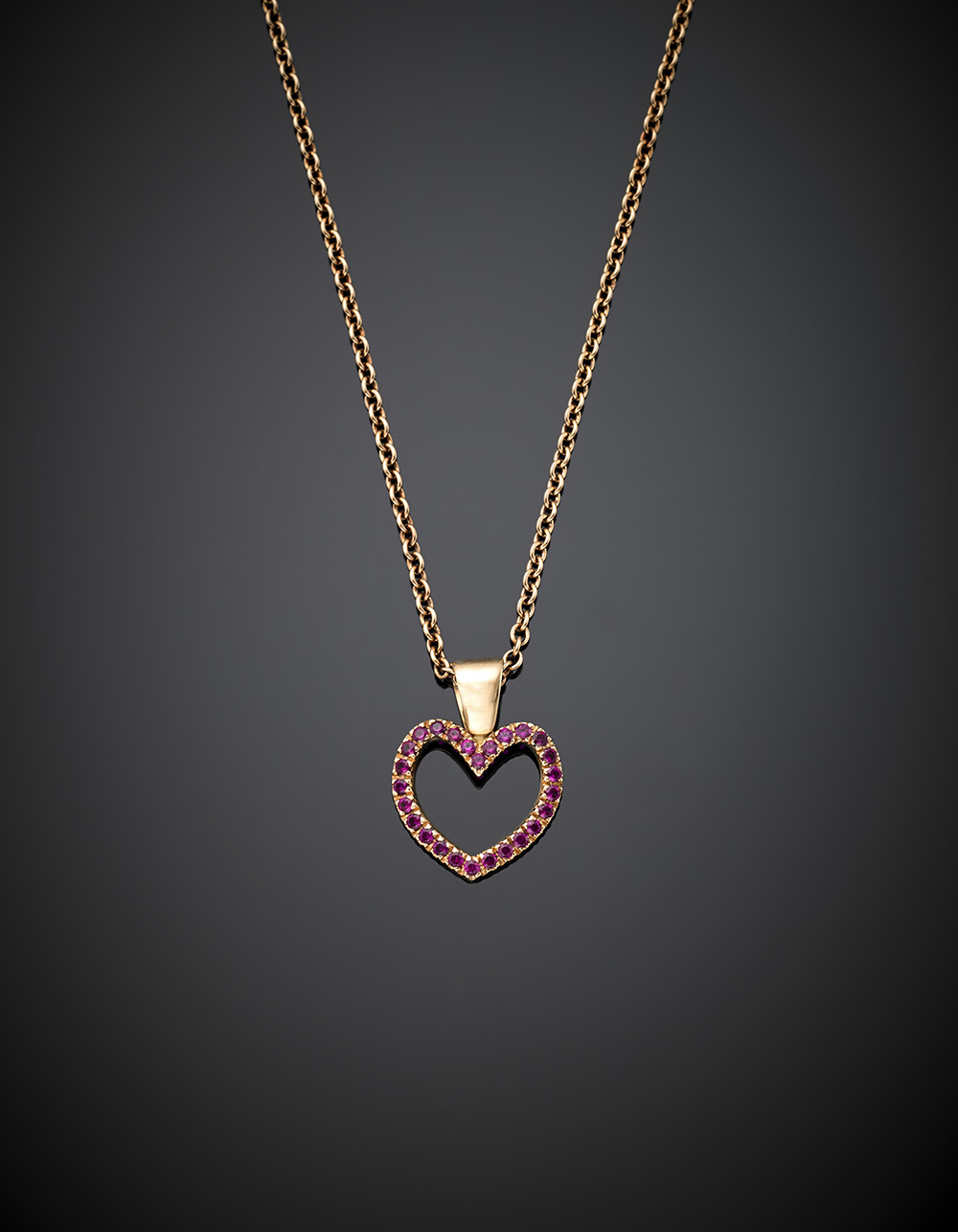 Catenina a rolò e pendente a cuore con rubini in oro rosa, g 6,64, lungh. cm 44 circa. Garanzia originale