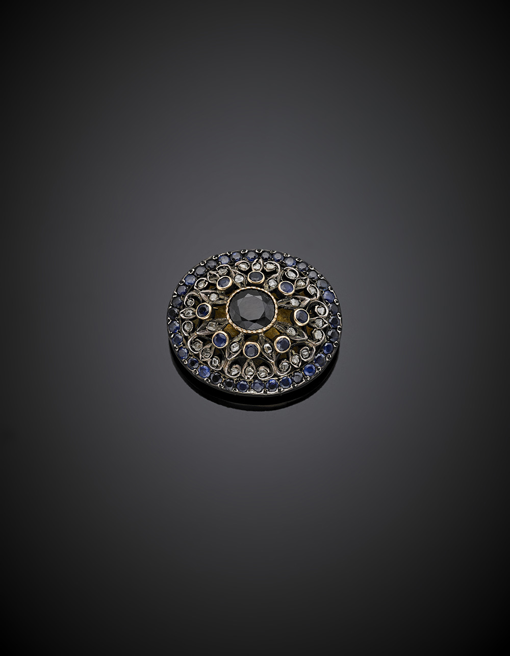 Spilla ovale bombata in oro, argento, diamanti e zaffiri, g 14,67, lungh. cm 3,5, largh. cm 2,8, h cm 2 circa.