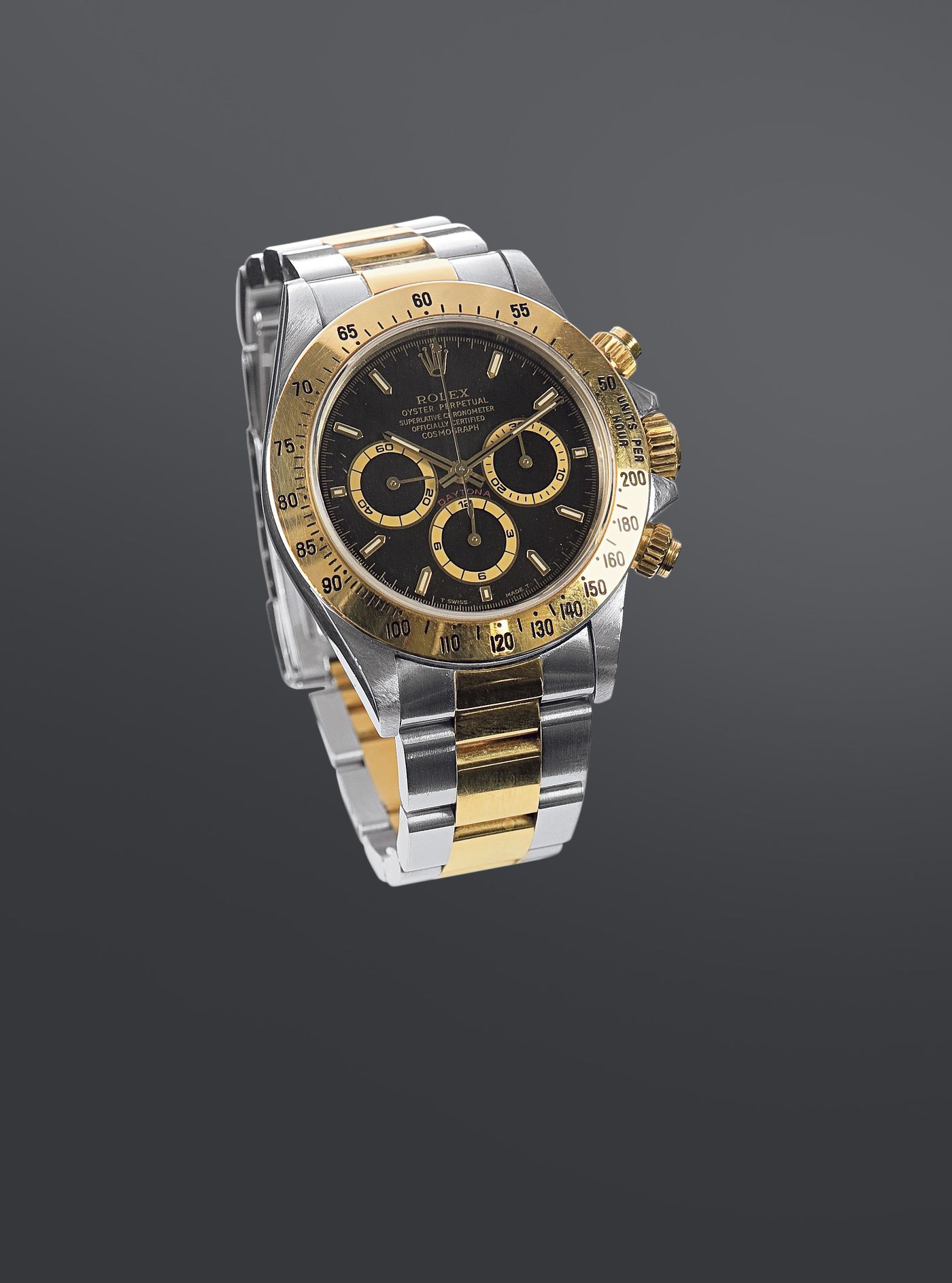 ROLEX Oyster Perpetual Cosmograph Dayton, ref. 16523 del 1990 Diam. 40 Cassa in acciaio e oro giallo in tre parti, con fondo, corona e pulsanti a vite; lunetta con scala tachimetrica incisa; bracciale oyster con chiusura fliplock; quadrante nero con indici applicati, contatore a 30 minuti e 12 ore Particolare modello fuori produzione Movimento automatico, calibro 4030 di derivazione Zenith El Primero