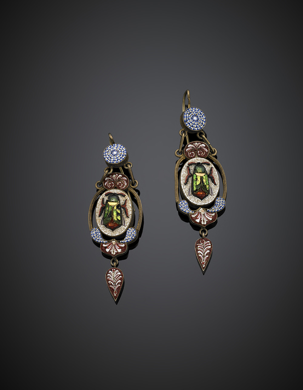 Lot 1209 | Orecchini pendenti in metallo e mosaico, g 12,63, lungh. cm 6,10...
