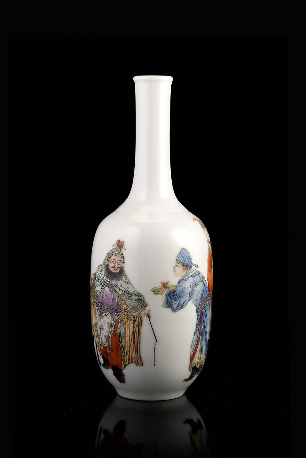 Vaso in porcellana policroma decorato con una figura leggendaria ed un asinello, con calligrafia, marchio Hongxian in rosso ferro