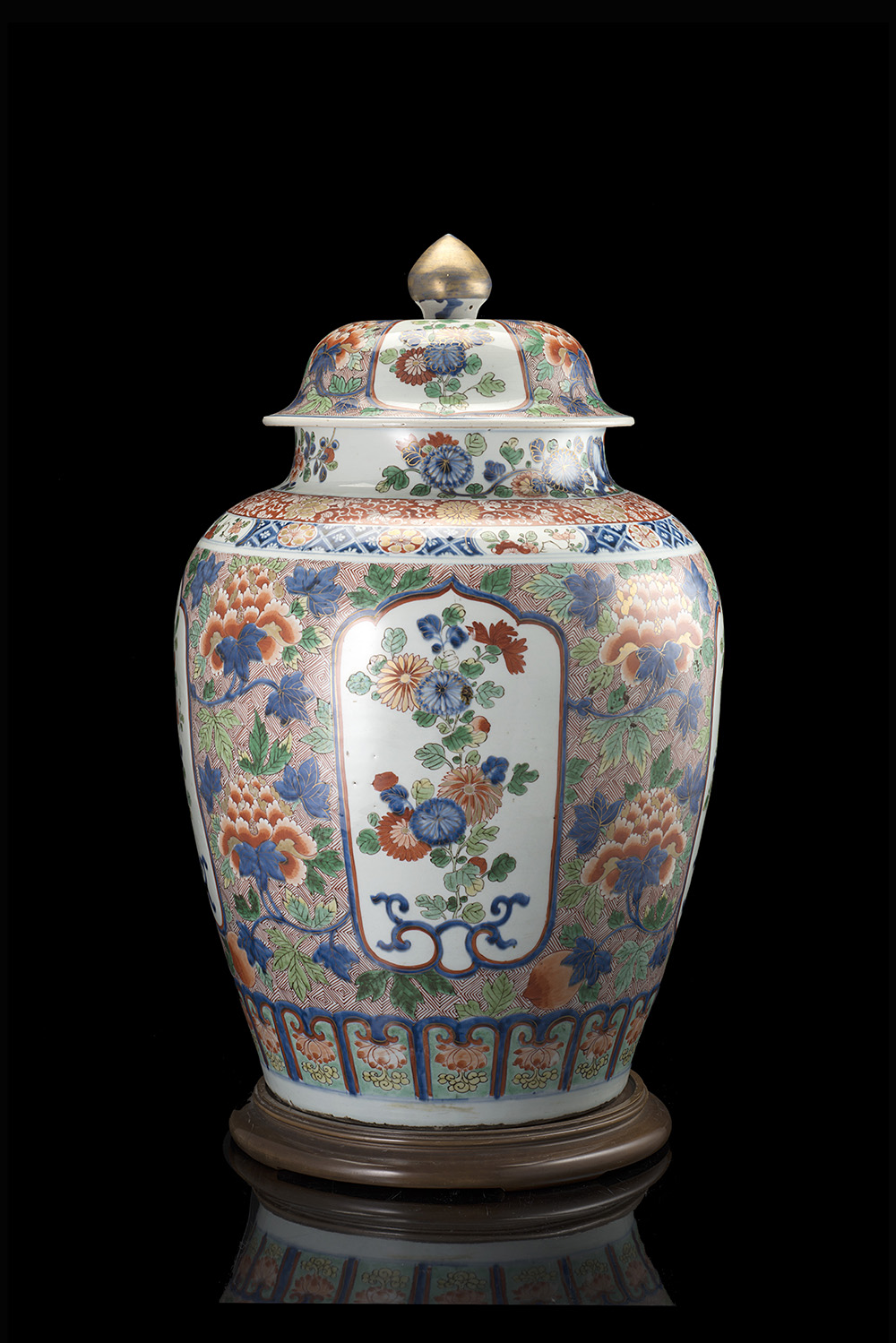 Potiche con coperchio in porcellana wucai a decoro floreale, con base in legno