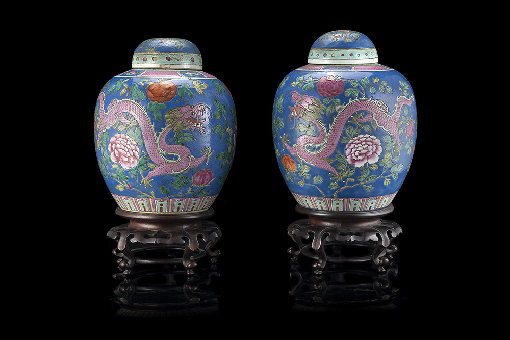 Coppia di potiche in porcellana policroma decorate con fiori, fenici e draghi, basi in legno (lievi difetti)