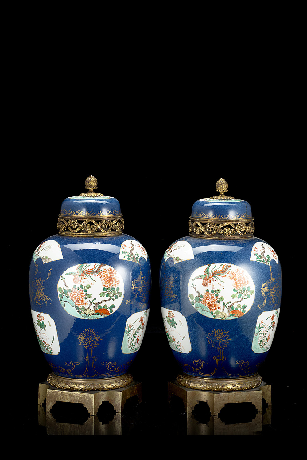 Coppia di 'ginger jar' con coperchio in porcellana blu polvere con decoro floreale in smalti Famiglia Verde e dorature, con montatura in bronzo dorato (restauri e mancanze)