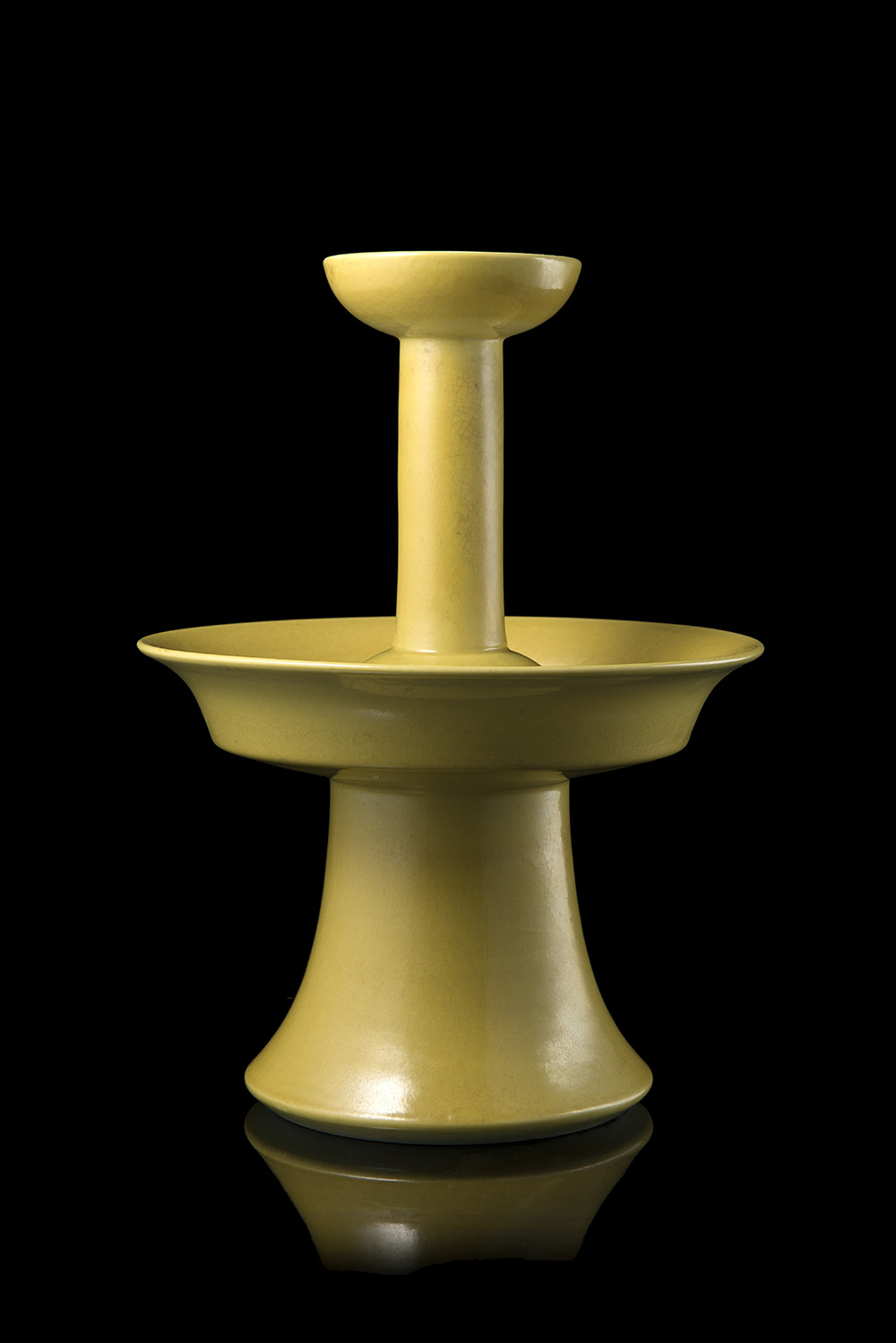 Candeliere in porcellana a invetriatura gialla con delicata craquelure, alla...