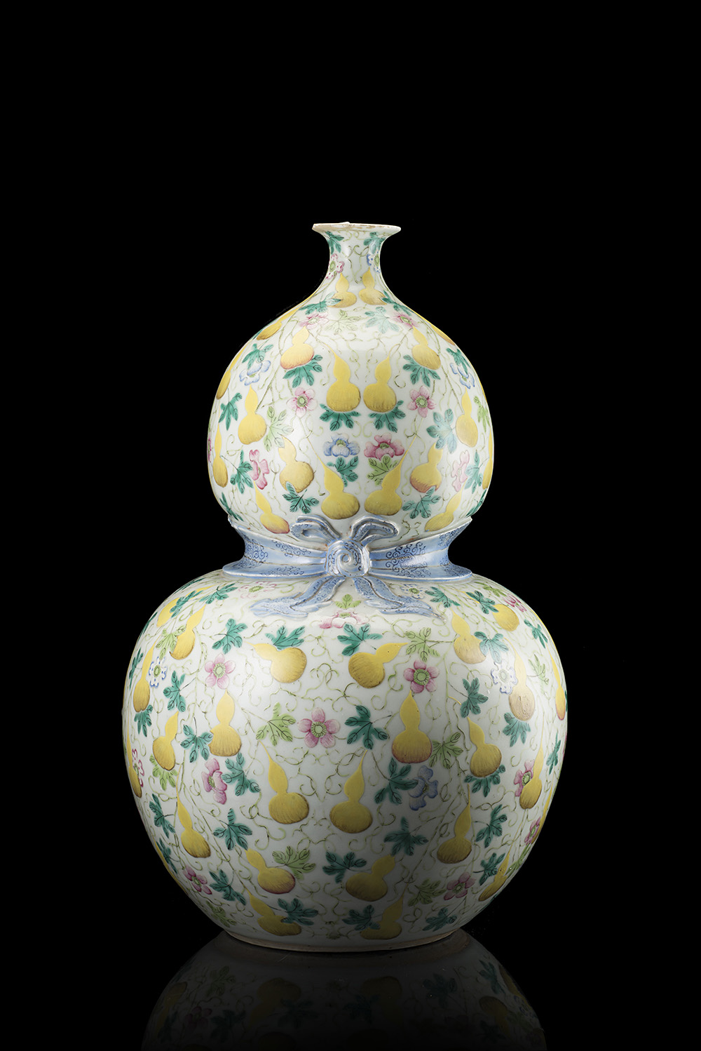 Vaso a doppia zucca in smalti Famiglia Rosa decorato con il motivo delle doppie zucche, marchio apocrifo Qianlong alla base (restauri)