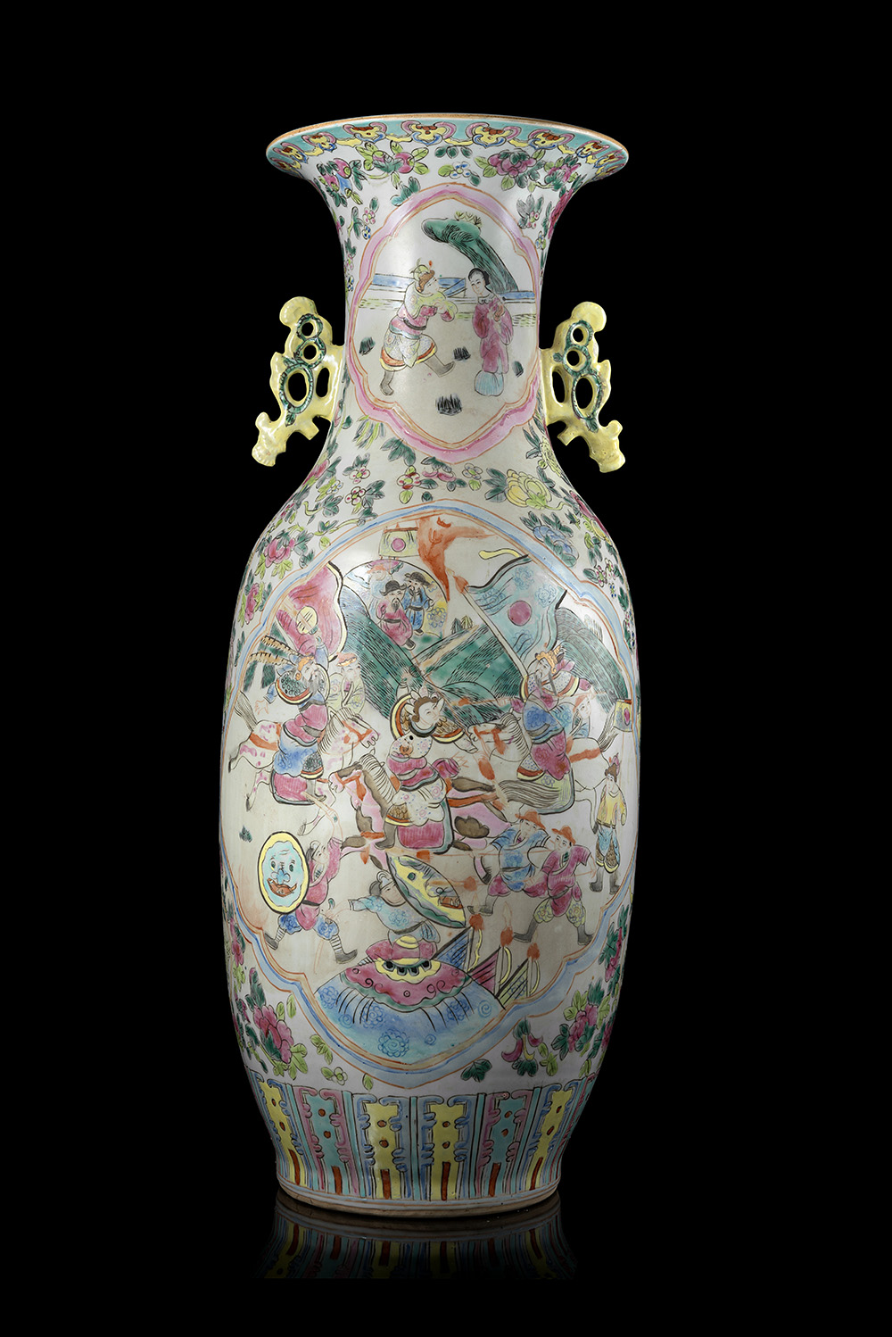 Vaso biansato in porcellana Famiglia Rosa decorato con scene di battaglia