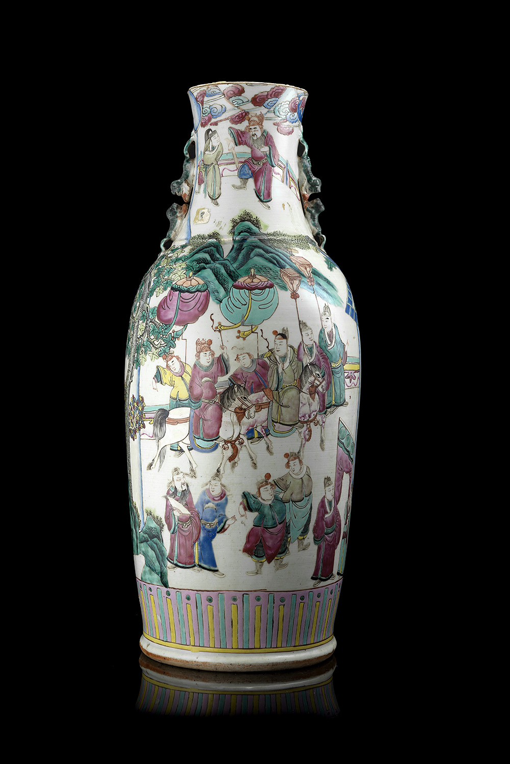 Vaso in porcellana Famiglia Rosa decorato con scena di battaglia, montato a...