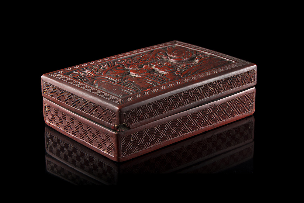 Scatola rettangolare con coperchio in lacca cinabro decorata con scena di paesaggio e motivi floreali