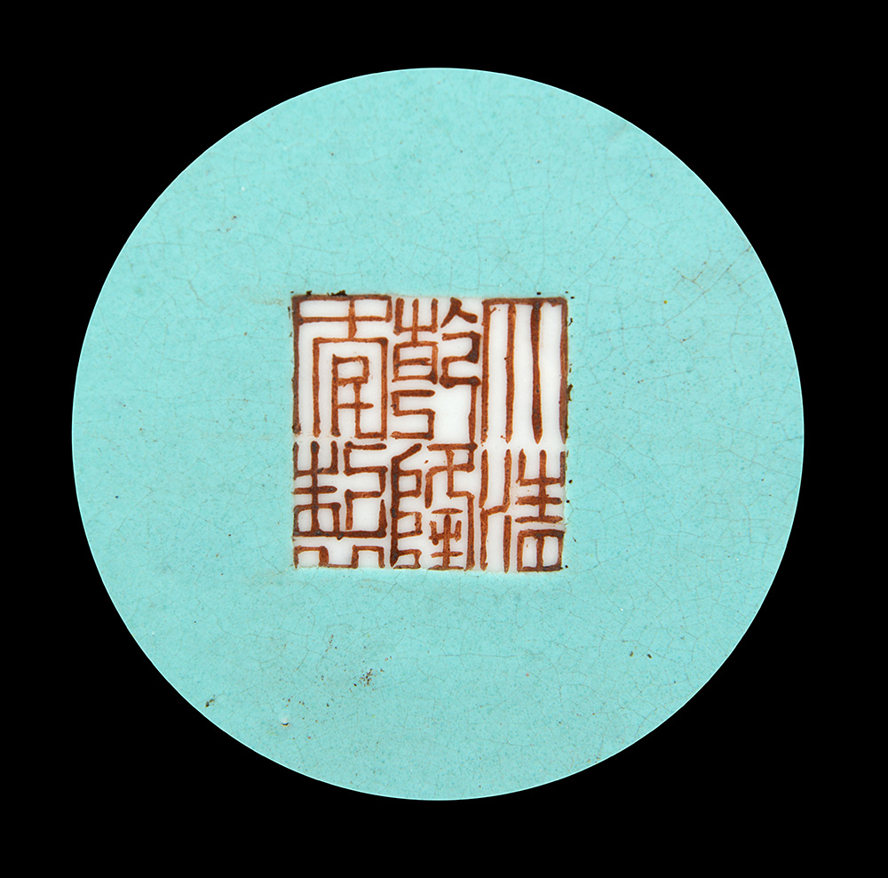 Vaso a balaustro Famiglia Rosa su fondo turchese decorato con coppia di fenici tra rami in fiore (difetti)