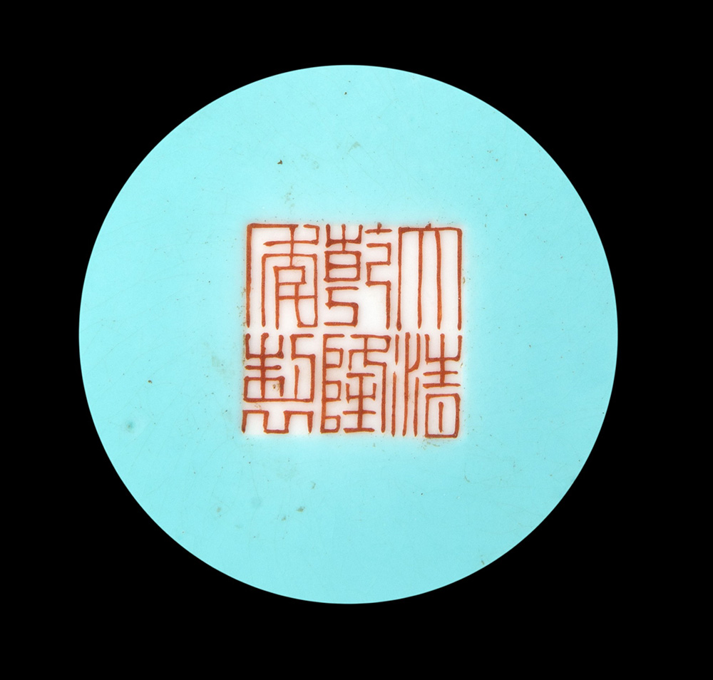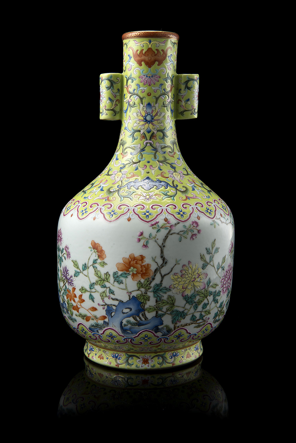 Vaso dalla forma arcaica con doppie anse tubolari decorato in Famiglia Rosa su fondo verde acido con scena di paesaggio, marchio apocrifo Qianlong alla base
