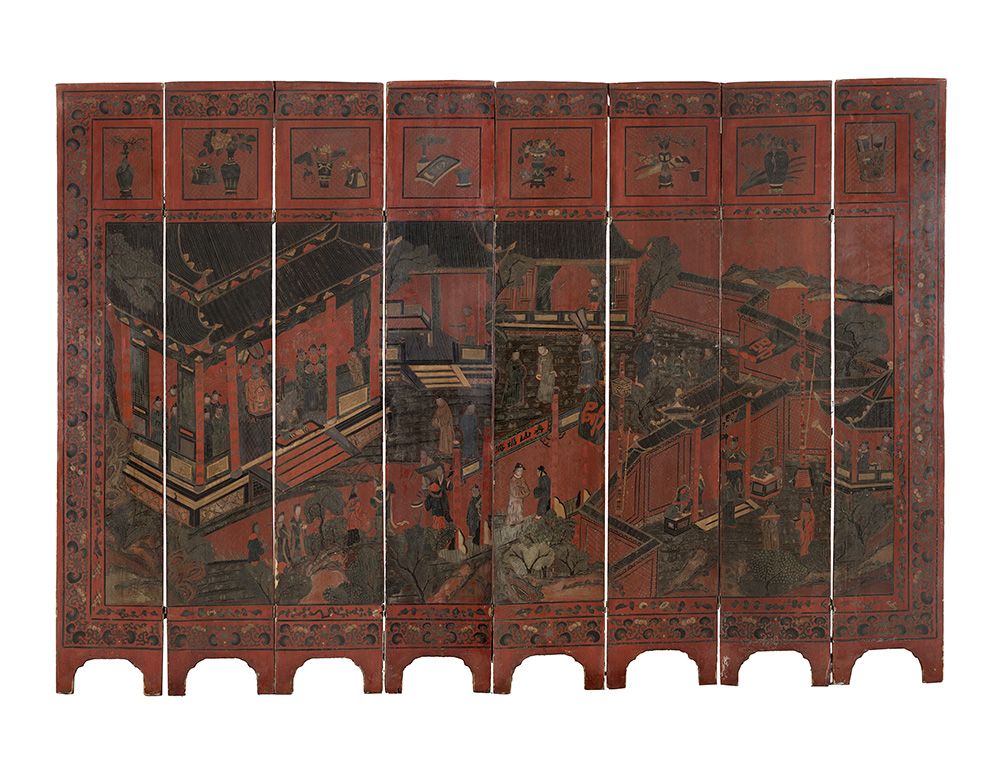 Paravento ad otto ante con decoro dipinto su fondo in lacca cinabro (difetti)