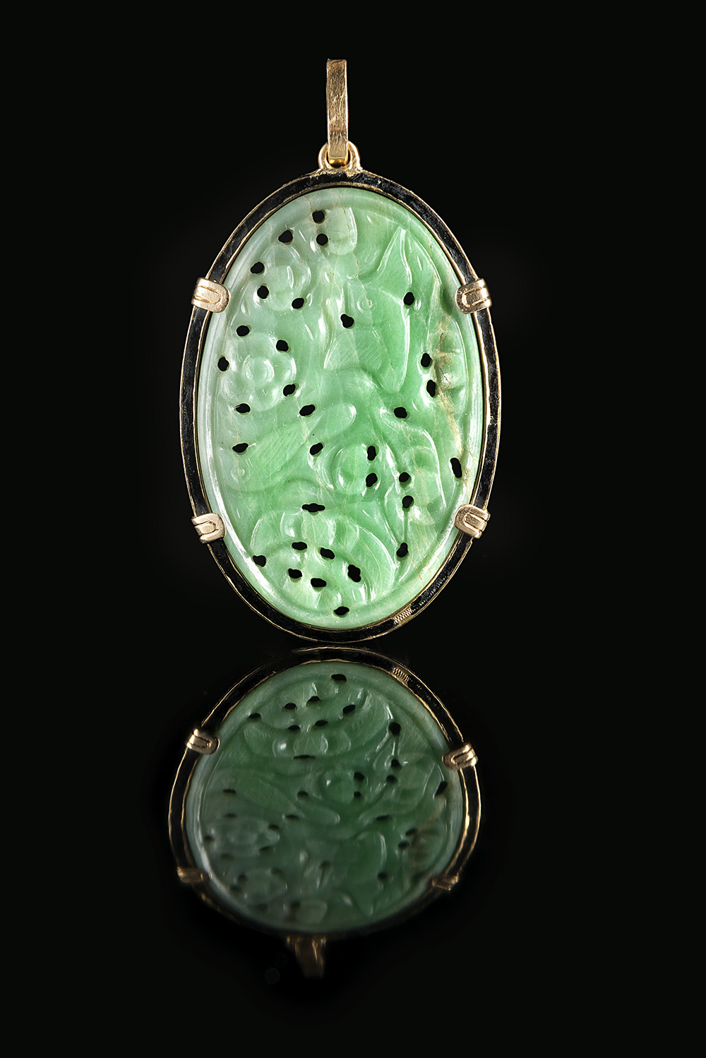 Pendente con placca in giadeite scolpita con volatili e motivi floreali montata in oro giallo