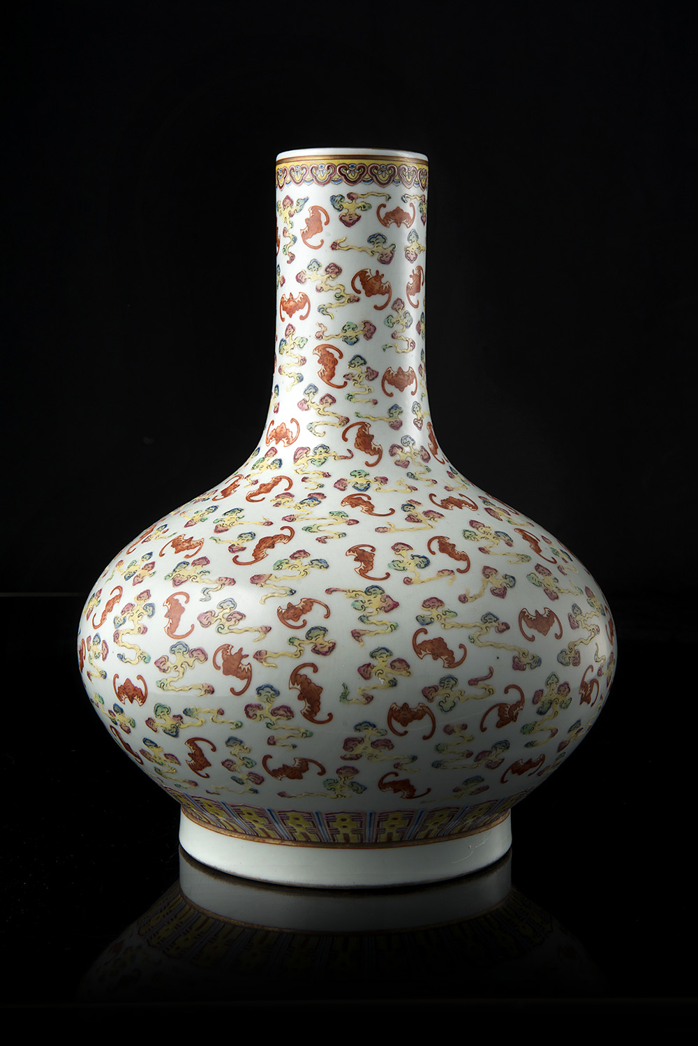 A Famille Rose 'hundred bats' bottle vase, enamelled throughout with numerous iron-red bats in flight amidst colourful clouds, the mouth rim encircled by a ruyi collar, and the base with upright lappets above the foot