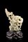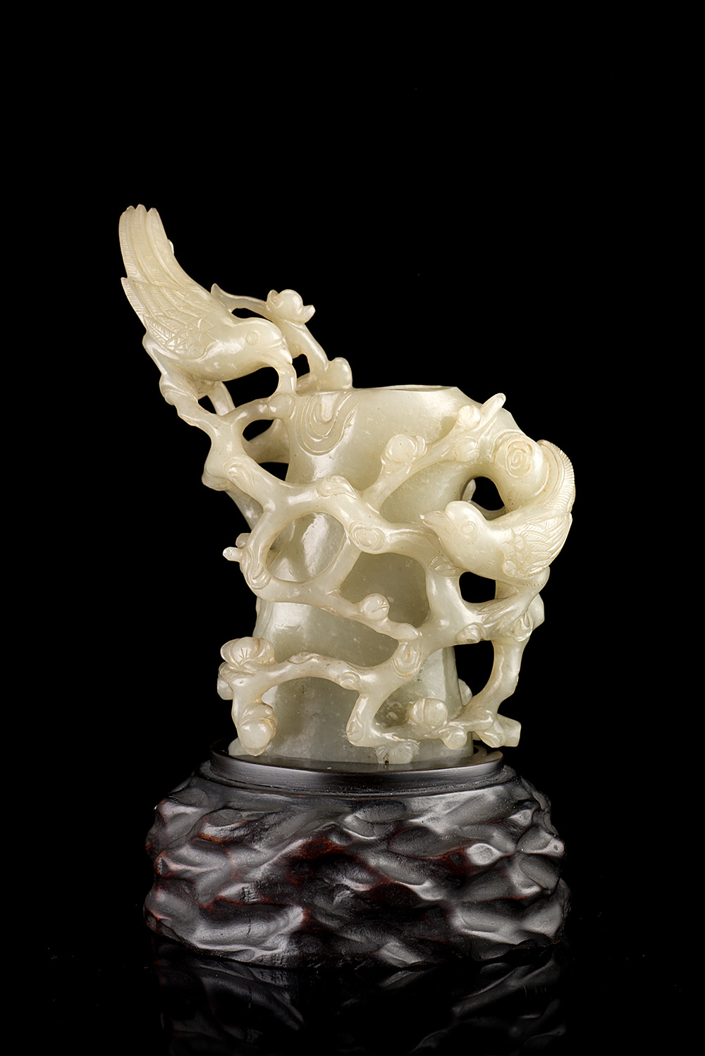 Portapennelli in giada celadon a guisa di tronco di pruno con rami in fiore e coppia di gazze, con base in legno