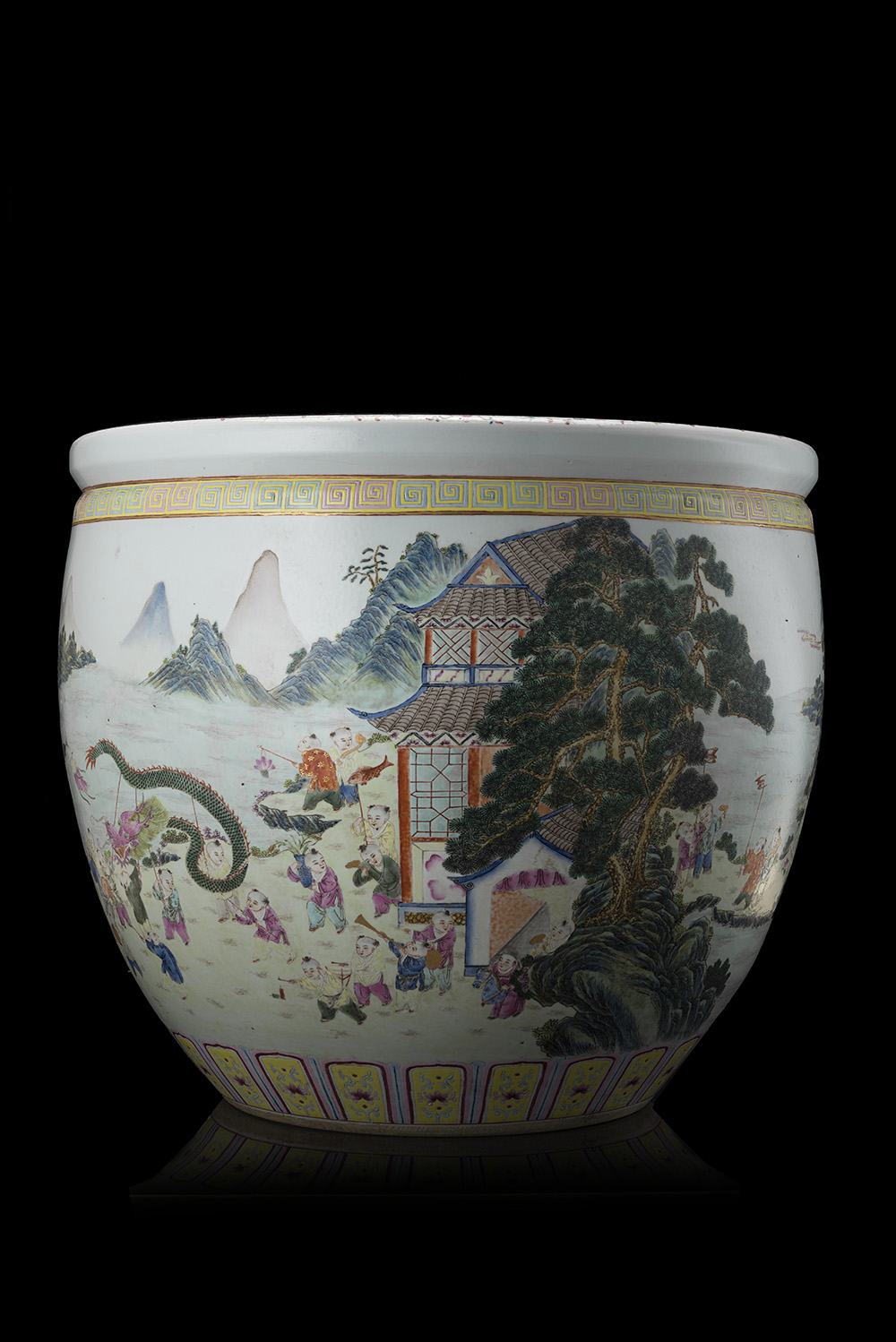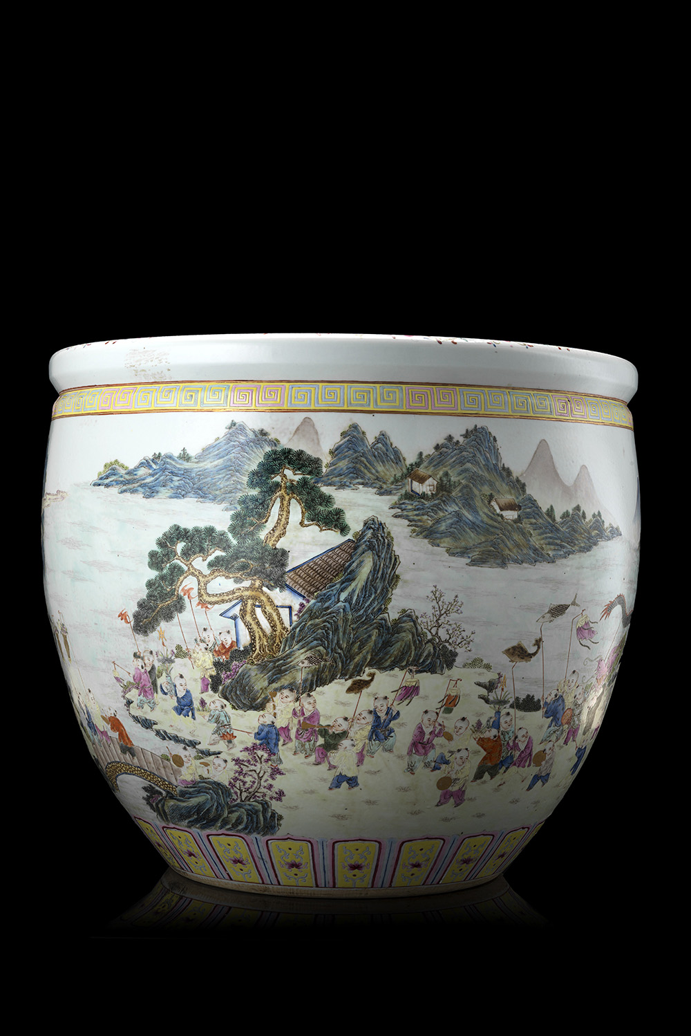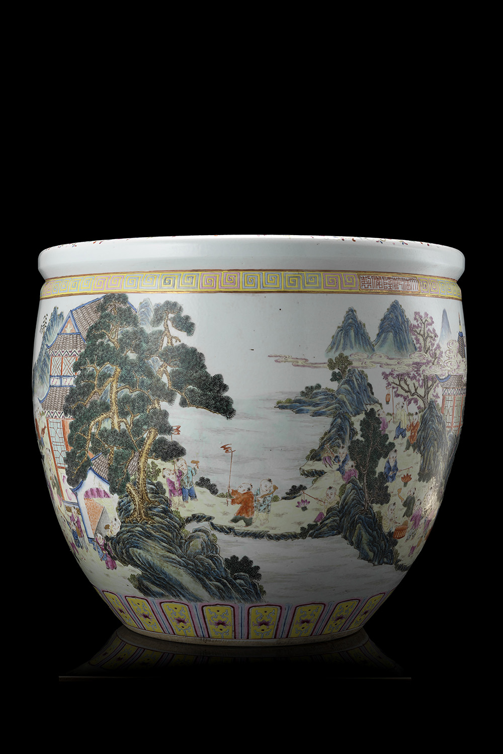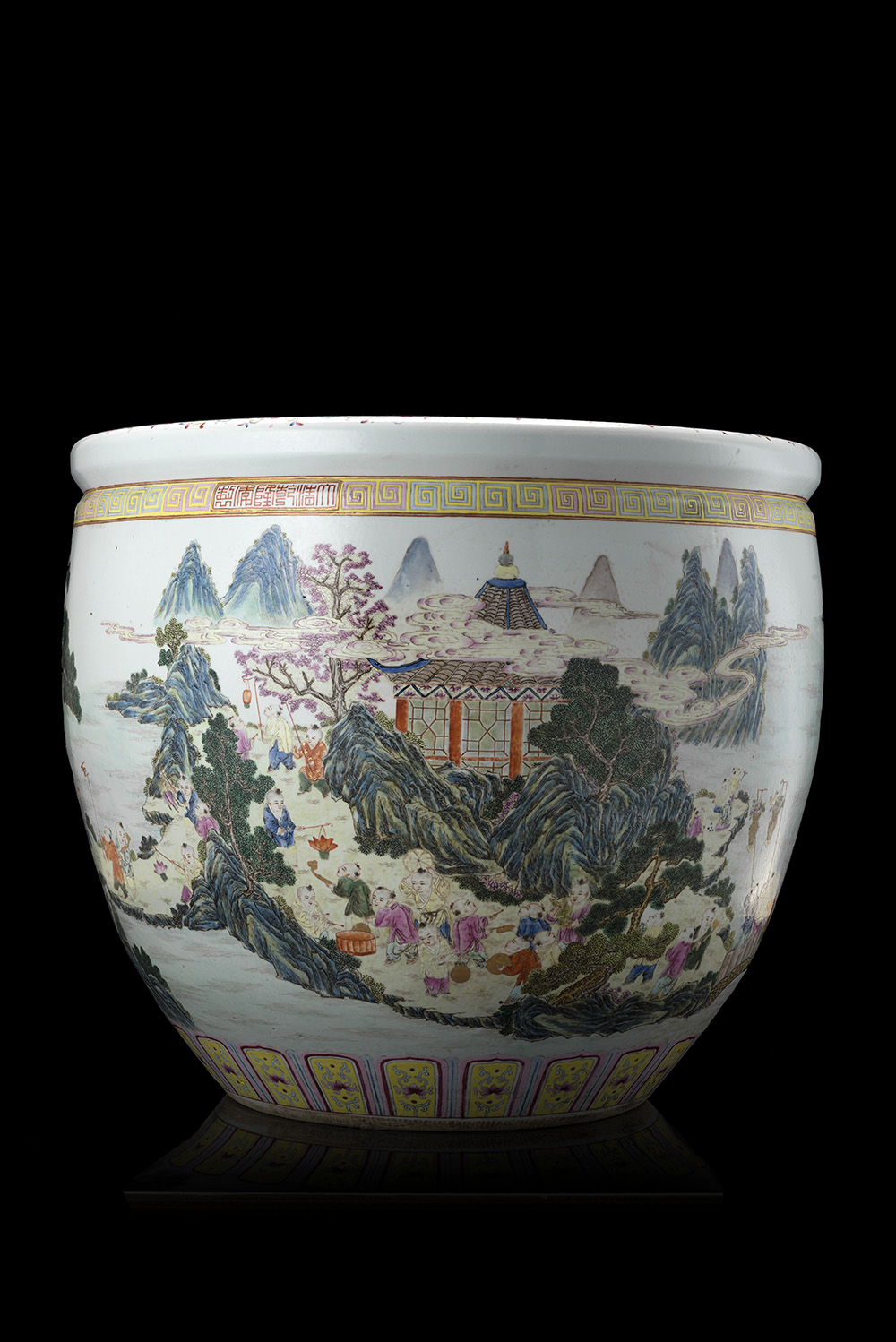 Grande jardiniere in porcellana Famiglia Rosa decorata con il tema dei "cento...