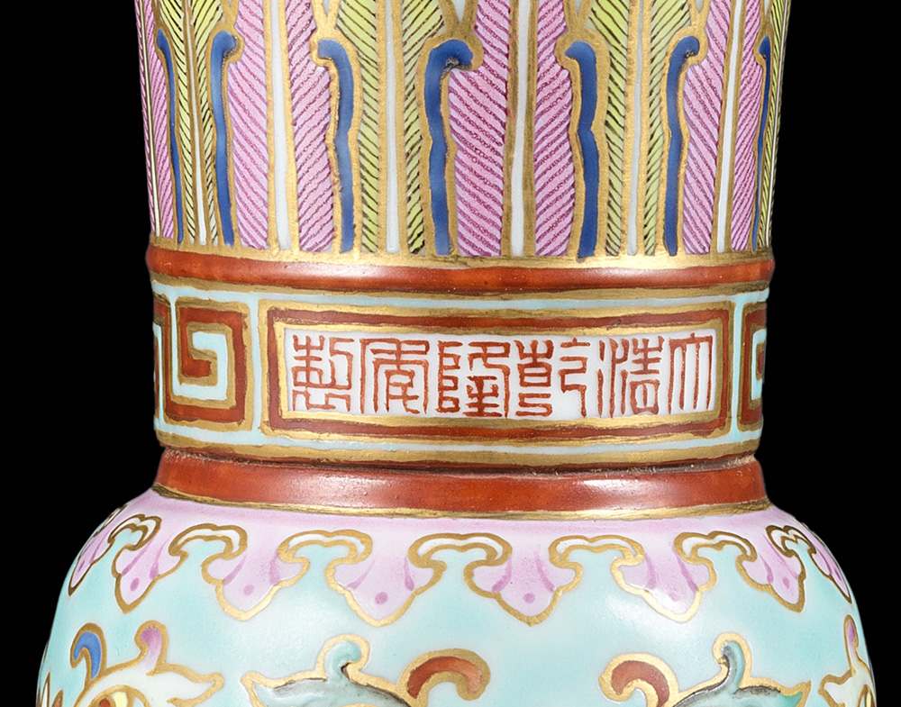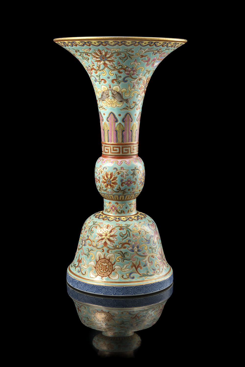 Vaso dalla forma gu a smalti Famiglia Rosa su fondo turchese, decorato con gli Otto Emblemi Buddhisti Bajixiang e motivi floreali, con marchio apocrifo Qianlong alla base