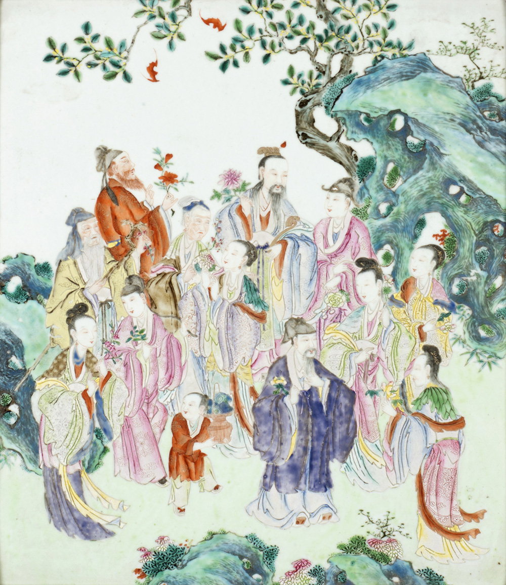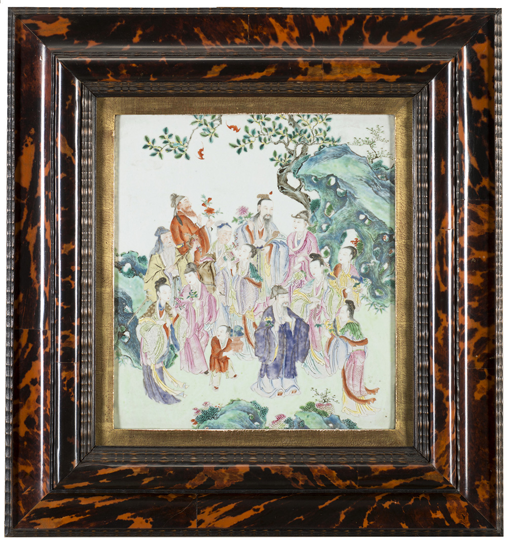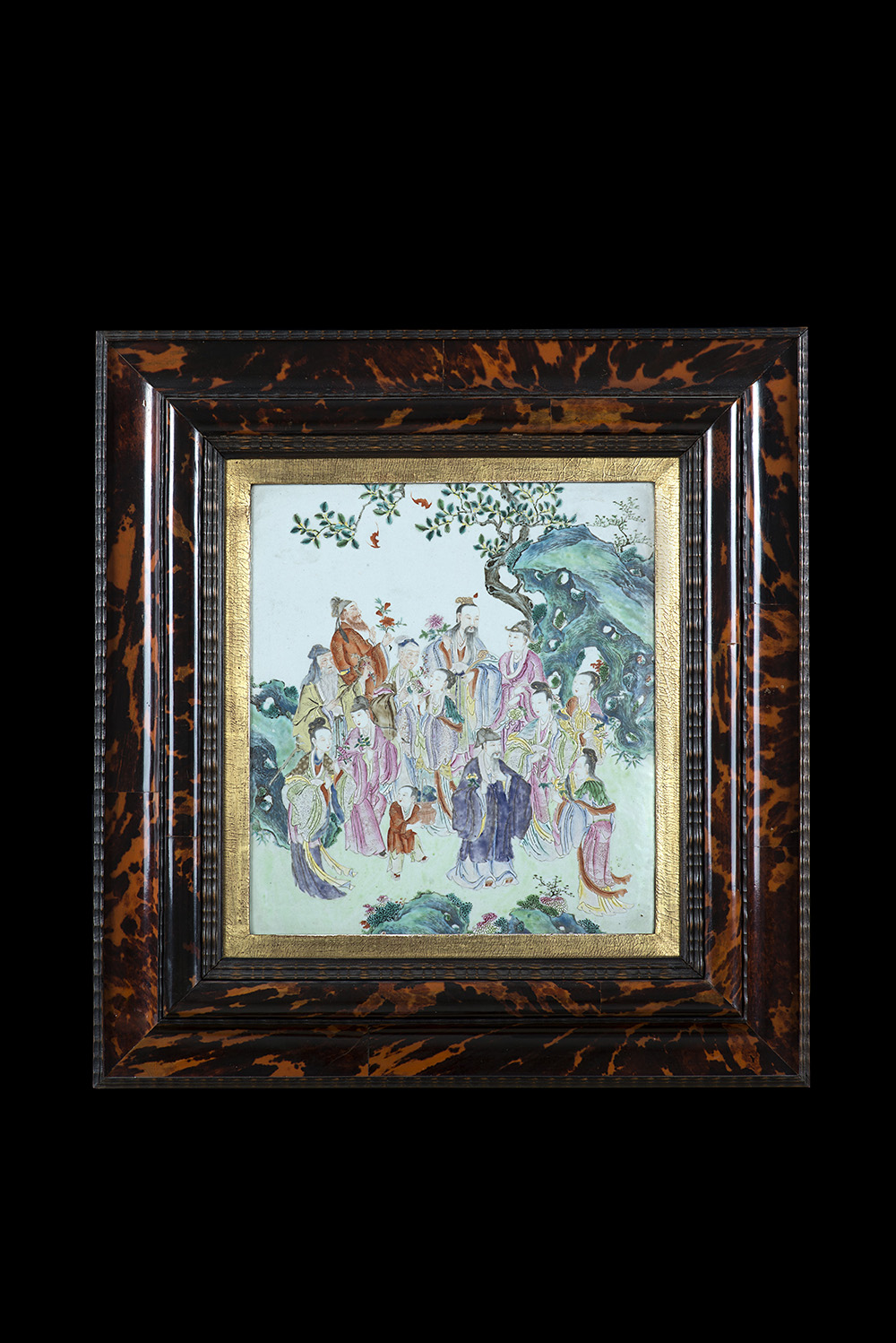 Placca in porcellana a smalti policromi decorata con Immortali, decorata sul retro, cornice in tartaruga