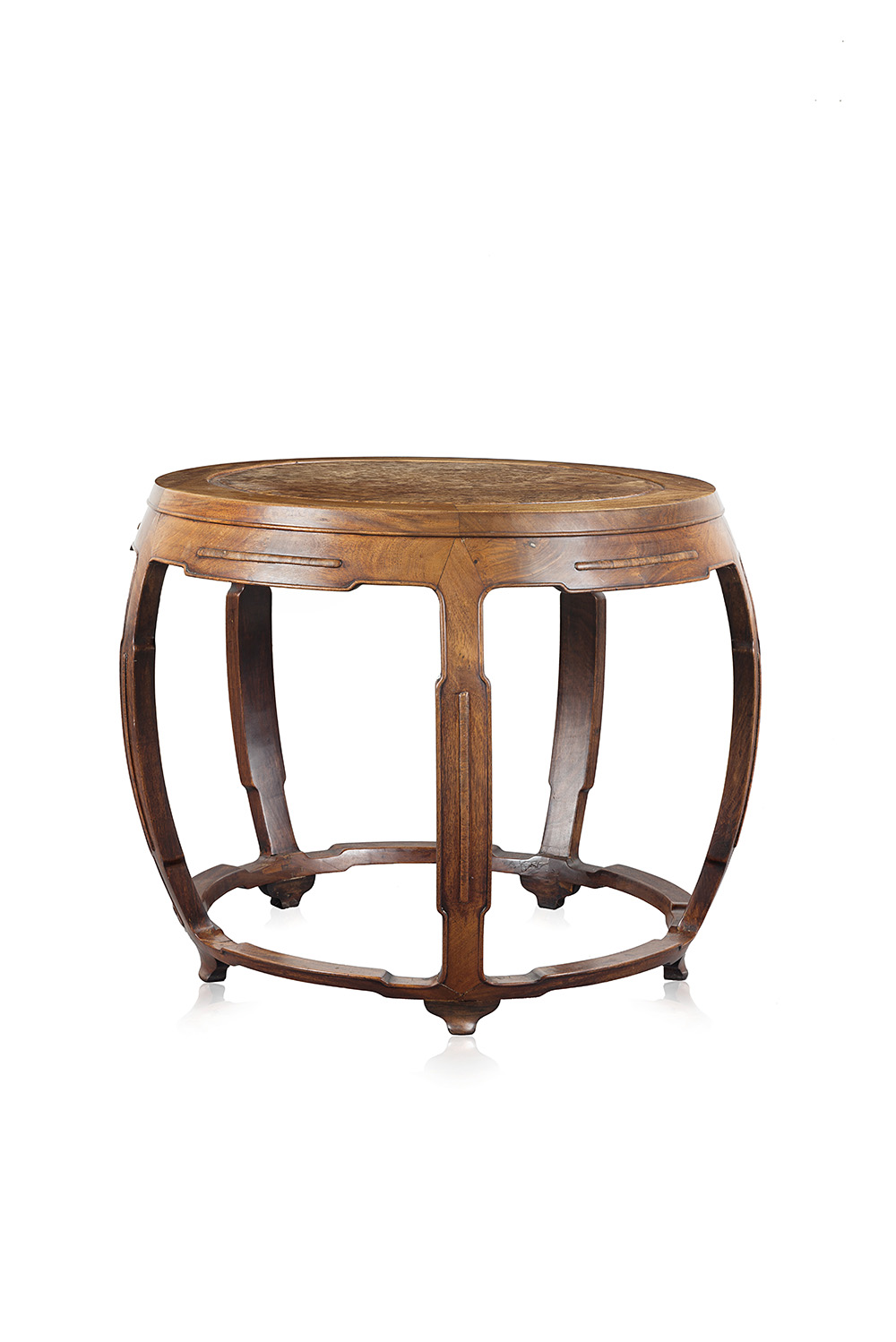 Round drum-shaped rosewood side table with inlaid burl wood top (slight defects)