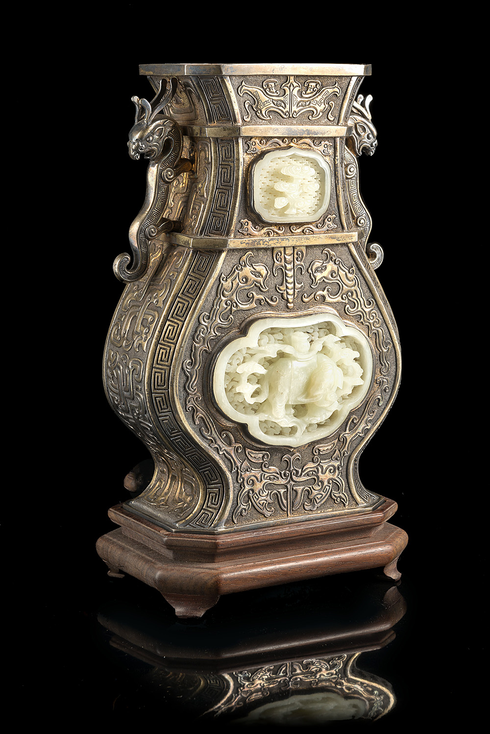 Vaso in metallo dorato dalla forma arcaica hu con doppie anse a dragoni con placche in giada bianca scolpite con funghi lingzhi ed elefanti, contornate da motivi arcaici, base in legno
