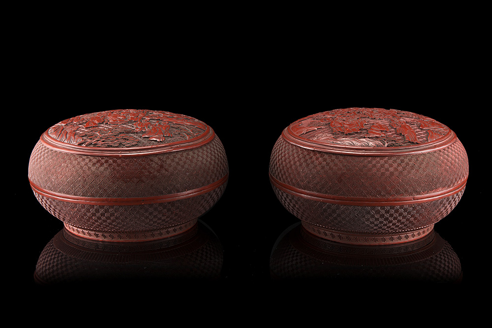A pair of circular cinnabar lacquer boxes and covers, each decorated with an Immortal and a boy in a landscape scene with floral motifs