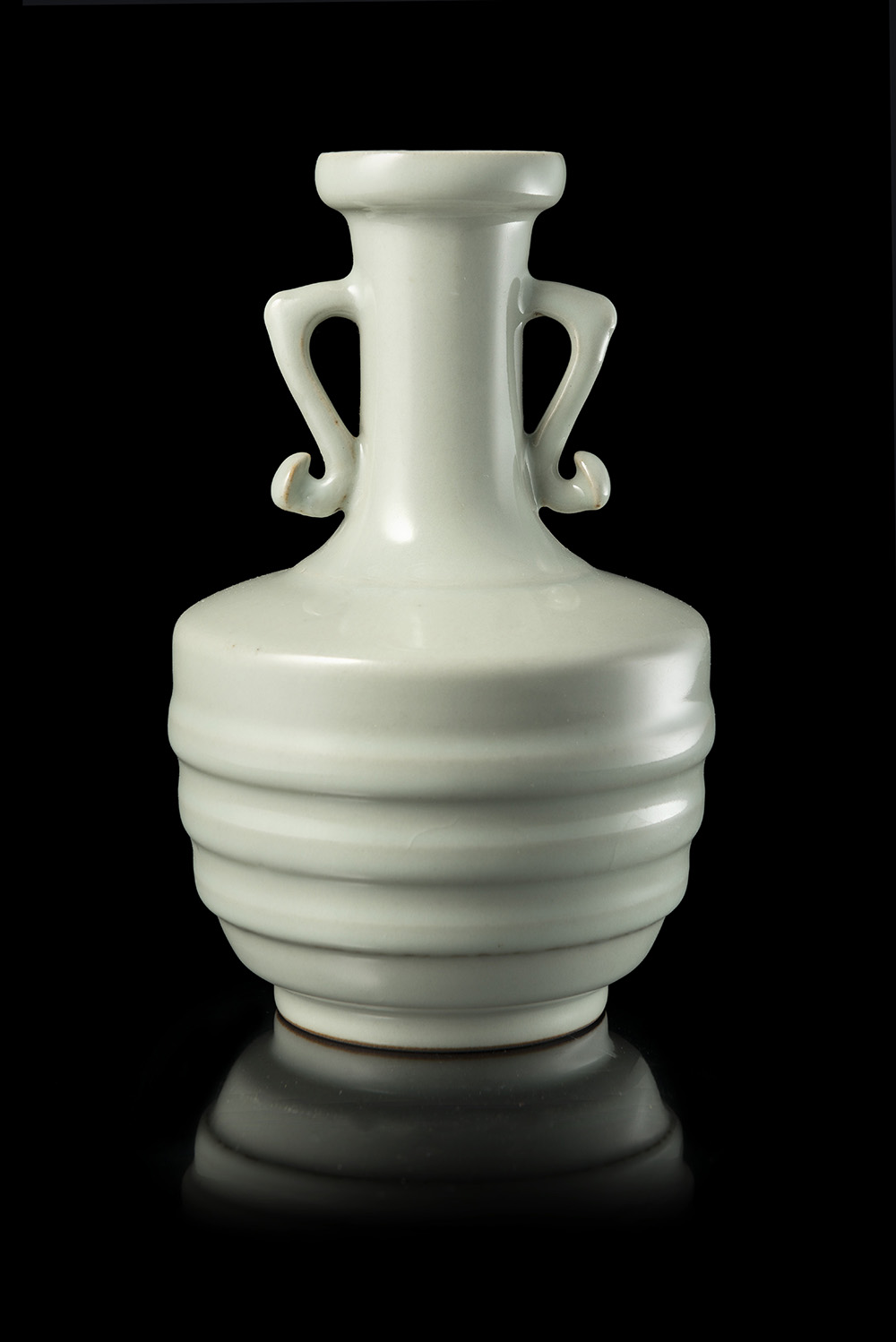 Vaso a bottiglia con anse a guisa di ruyi, con invetriatura color celadon pallido, il corpo con bande a rilievo