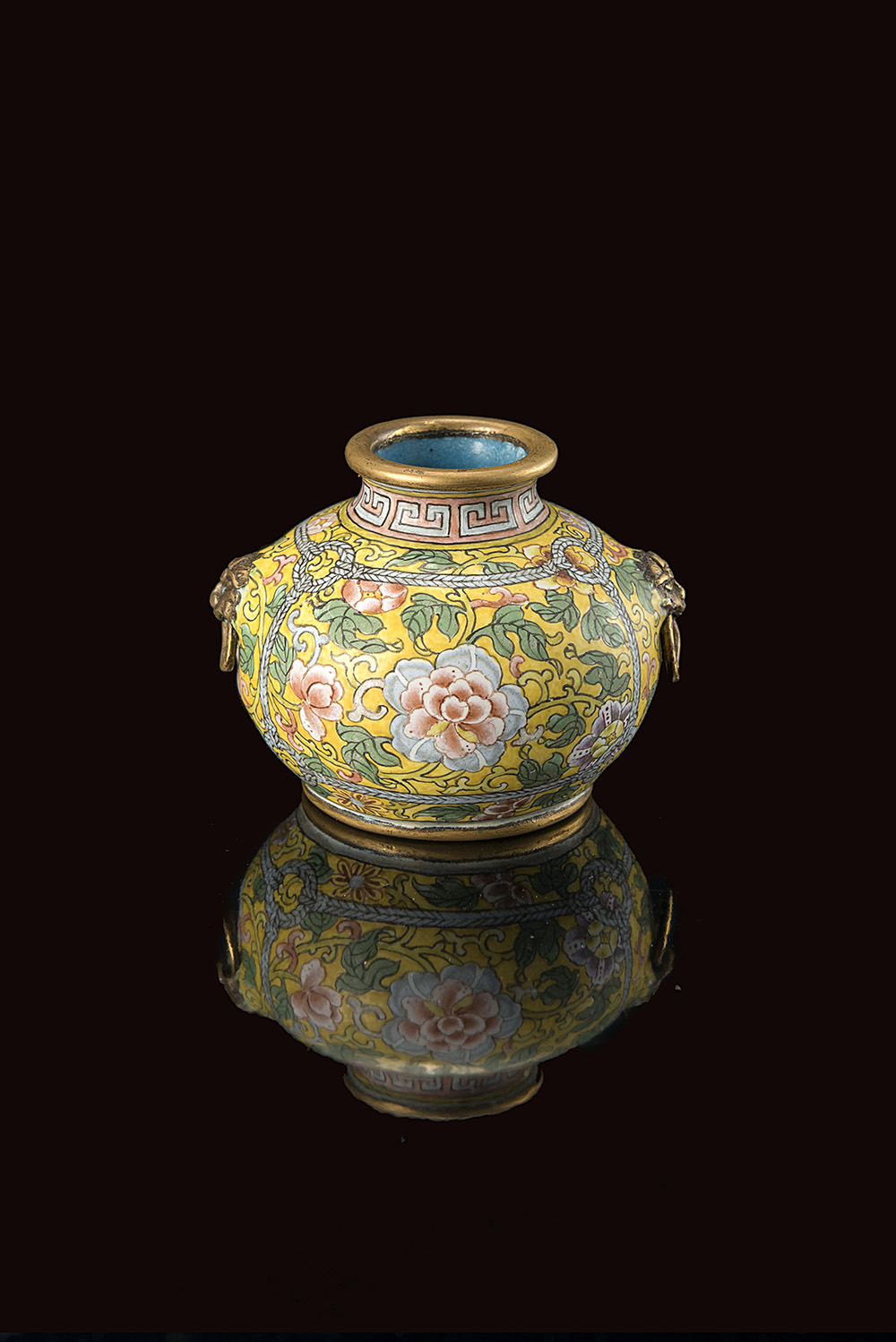 Piccolo vasetto con doppie anse a guisa di leoni Buddhisti con anelli, decorato in smalti di Pechino con fiori e racemi su fondo giallo, al collo una banda geometrica decorativa