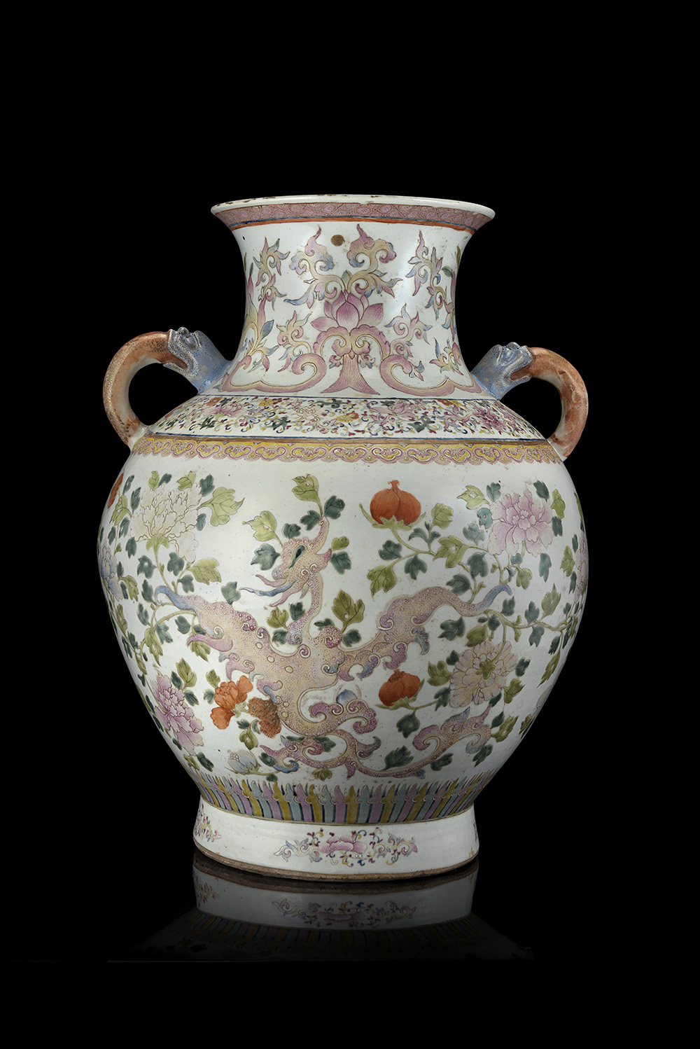 Grande vaso biansato in porcellana Famiglia Rosa decorato con fenici in stile arcaico tra rami di pesco e peonie