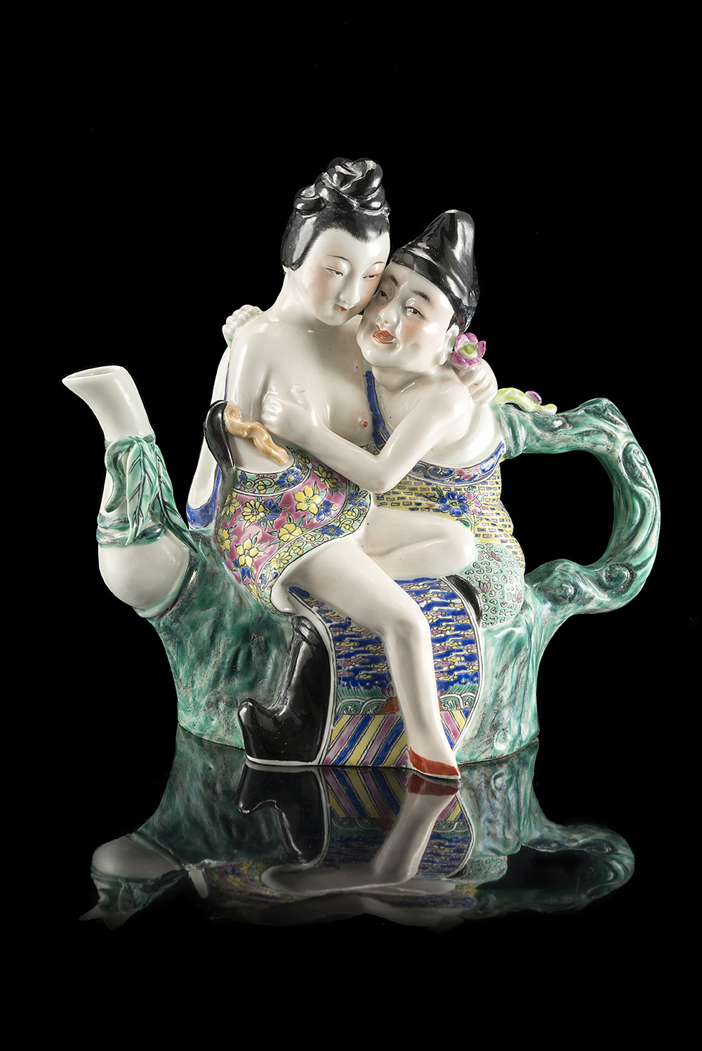 Teiera in porcellana policroma decorata con scena eroticaCina, secolo XX(h....