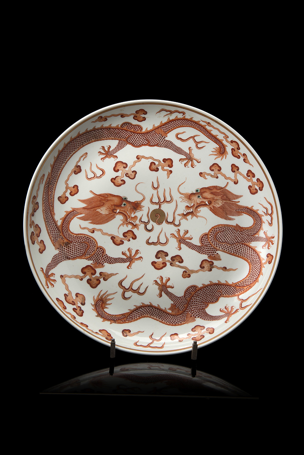 Grande piatto in smalti rosso ferro e dorature decorato con coppia di draghi a cinque artigli che si fronteggiano per la perla sacra