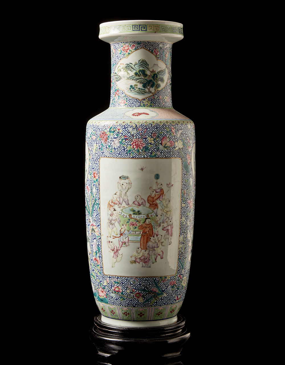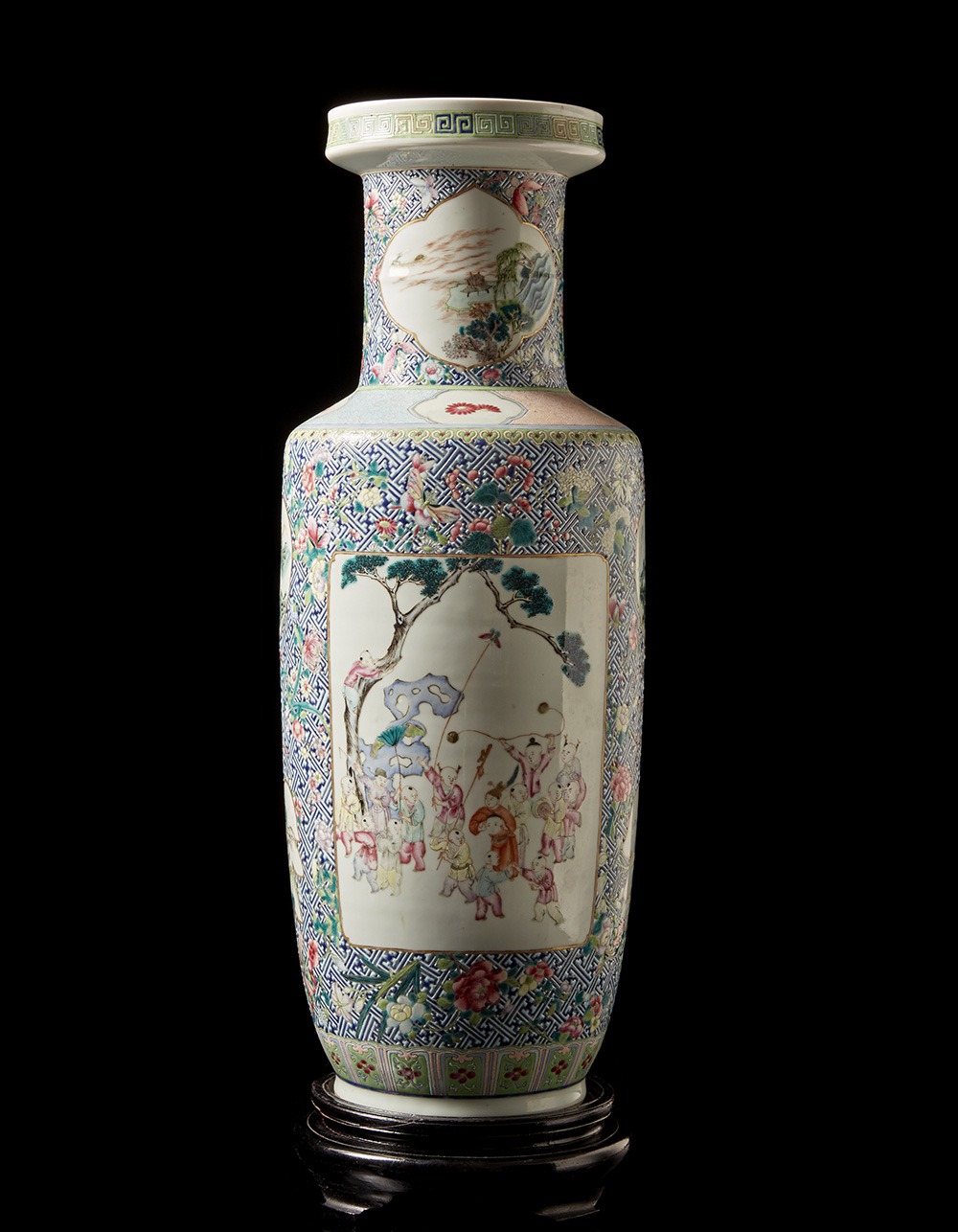 Vaso rouleau in porcellana Famiglia Rosa raffigurante pannelli con bambini e simboli di buon auspicio su fondo a motivi geometrici, base in legno (lievi difetti)