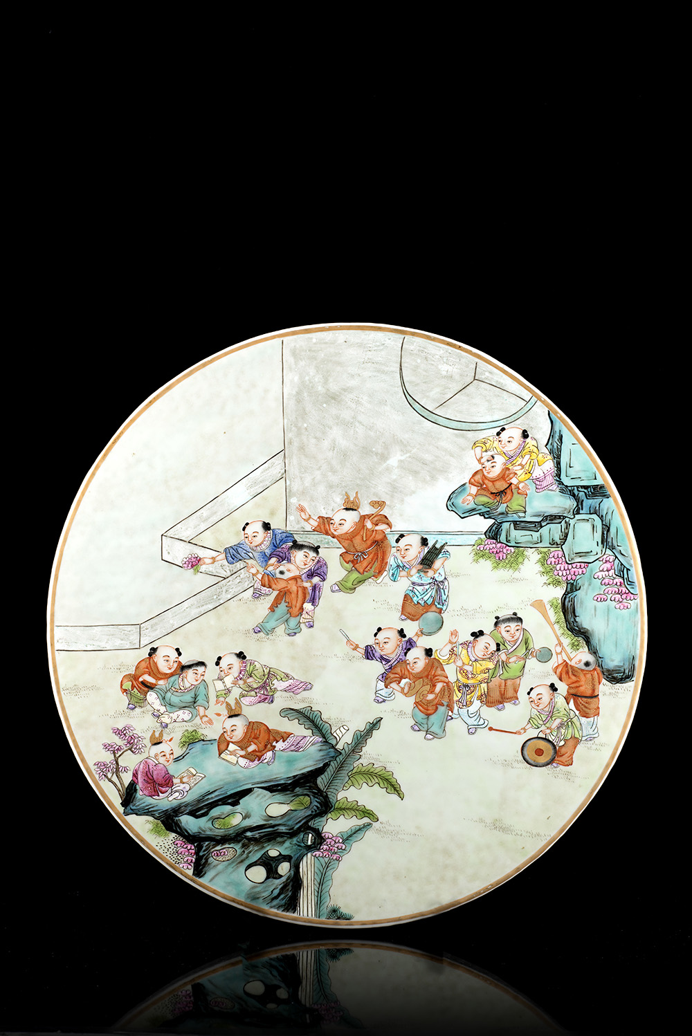 Placca rotonda in porcellana a smalti Famiglia Rosa decorata con fanciulli in giardino (difetti)