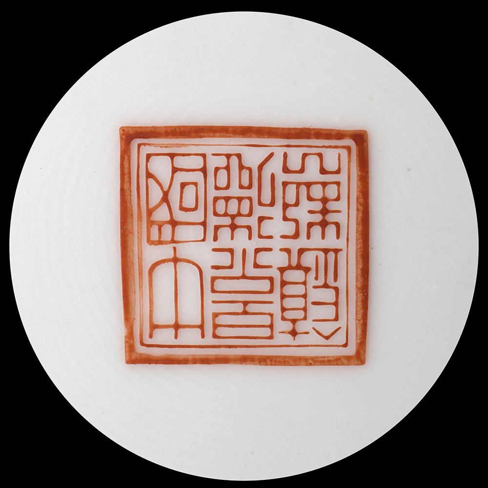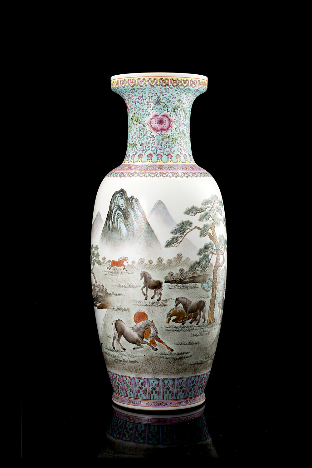 Vaso a tromba in porcellana decorata con smalti della famiglia Verde a figure in un paesaggio ed iscrizioni